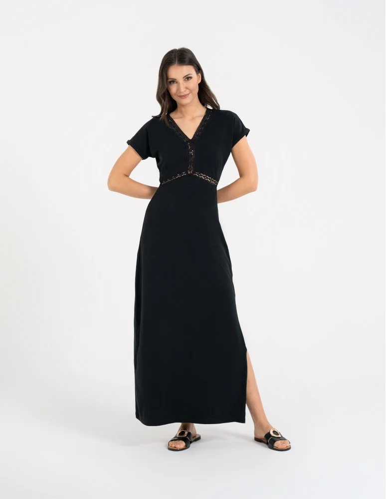 Sukienka damska maxi z dekoltem w serek i rozcięciem CZARNY