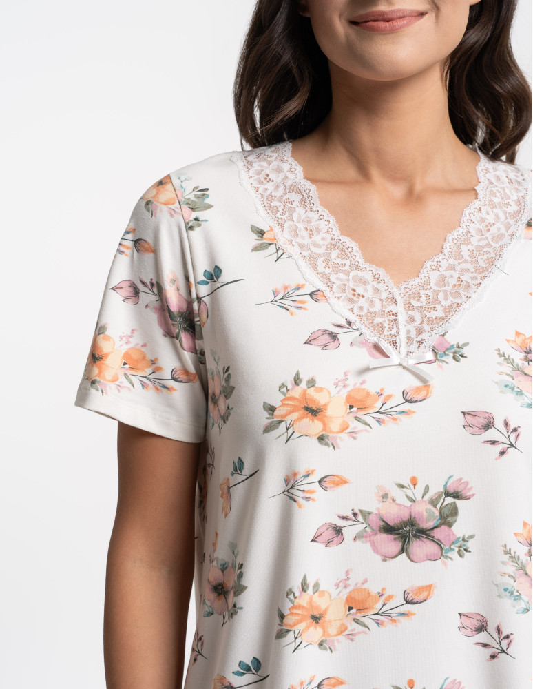 Koszula nocna damska z krótkim rękawem i koronką ECRU