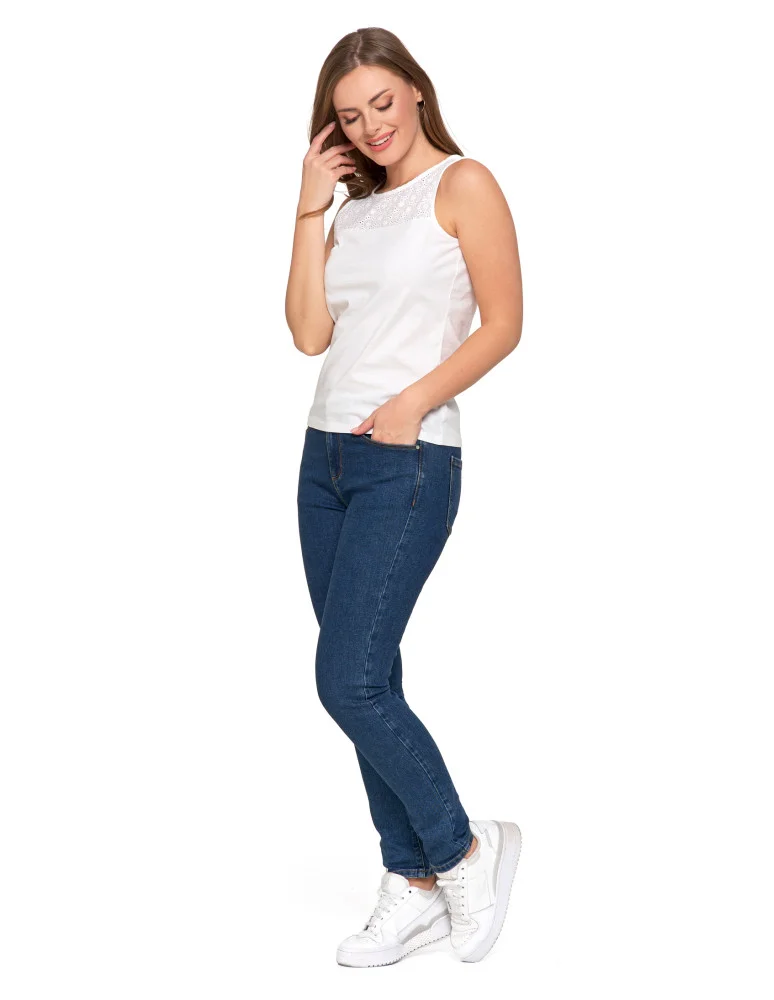 Damska bluzka bez rękawów bawełniana z ażurowym wykończeniem BIAŁY