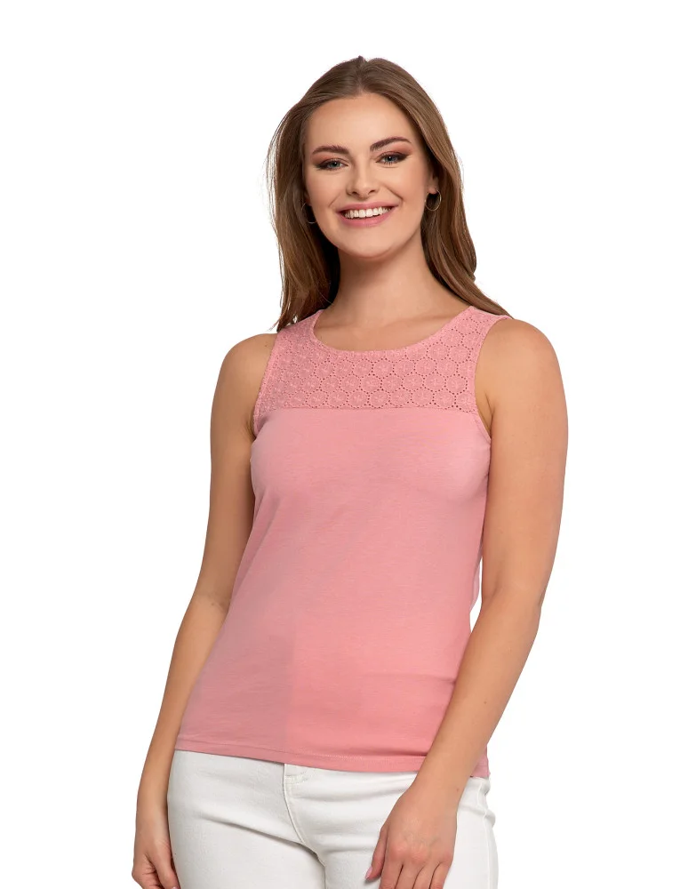 Damska bluzka bez rękawów bawełniana z ażurowym wykończeniem RÓŻOWY