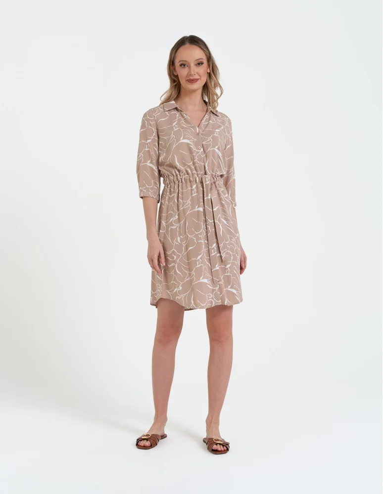 Model łączy swobodny, lekko boxy krój z delikatnym taliowaniem, które subtelnie podkreśla kobiecą sylwetkę. Wiązanie w pasie pozwala dopasować sukienkę do własnych preferencji i nadaje całości lekkości. Delikatny kołnierzyk oraz zapięcie na guziki dodają klasycznego charakteru, dzięki czemu model sprawdzi się zarówno w pracy, jak i podczas codziennych wyjść.