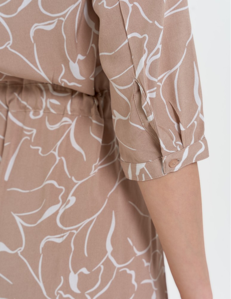 Uniwersalny, subtelny print nadaje sukience nowoczesnego, a jednocześnie stonowanego wyrazu. To idealna propozycja dla kobiet, które szukają lekkiej sukienki z wiskozy na sezon wiosenno-letni.
