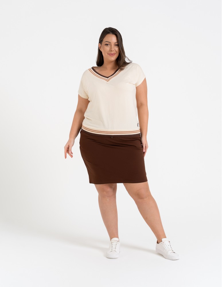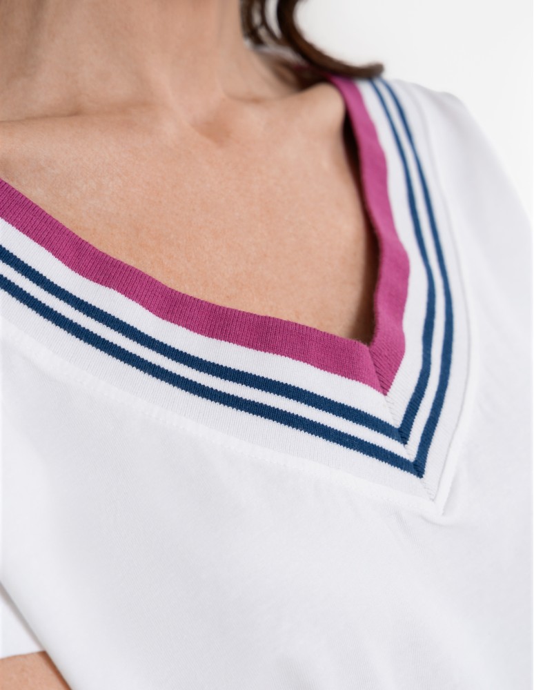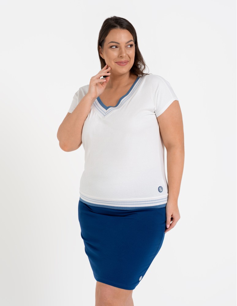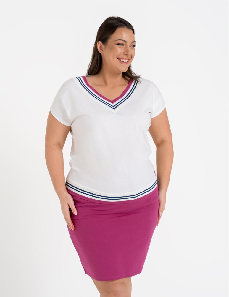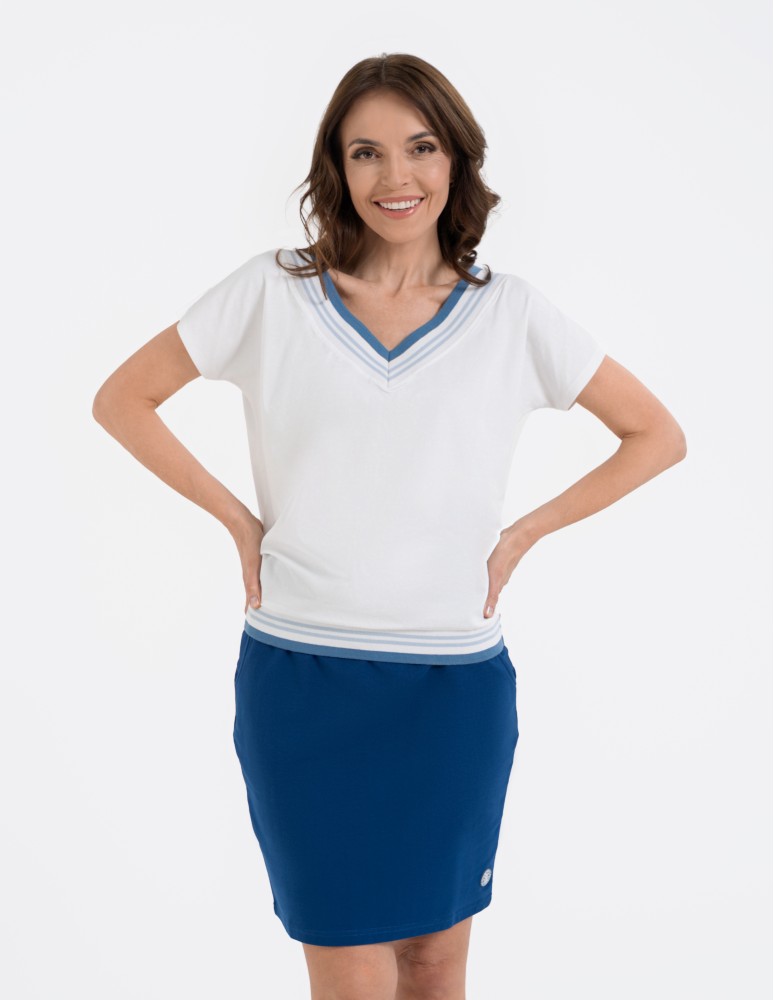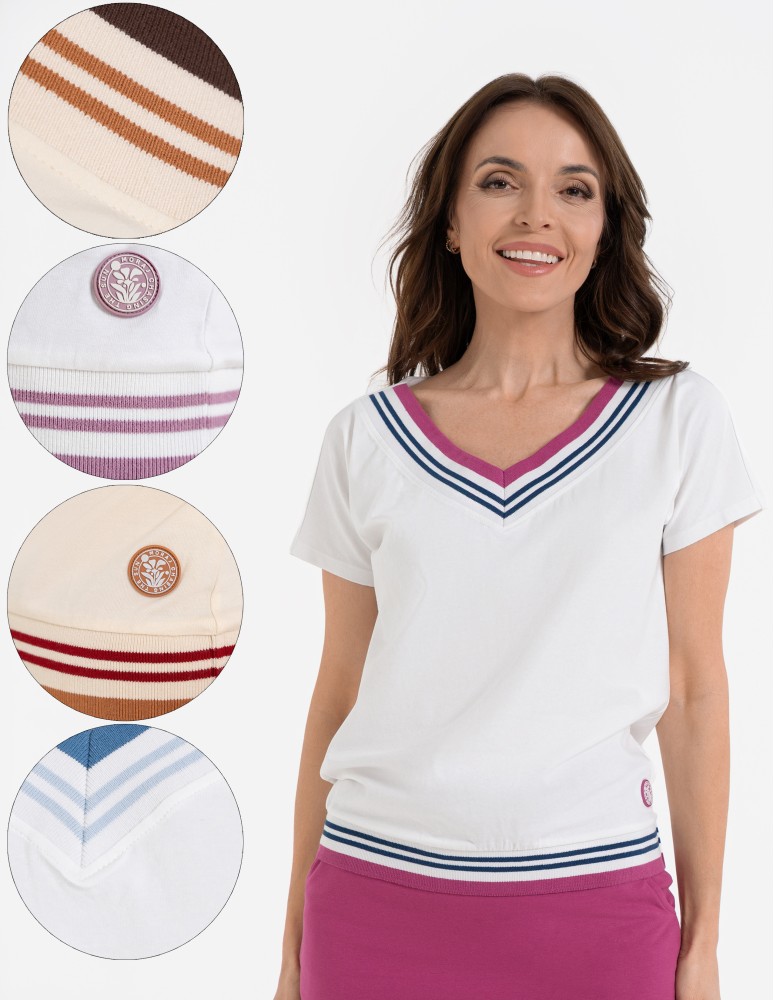 Damska bluzka o swobodnym kroju, która łączy sportową dynamikę z codzienną elegancją. Uwagę przyciąga efektowny dekolt w kształcie litery V, wykończony szerokim, elastycznym ściągaczem z kontrastowymi paskami. Podobny detal znajduje się na dole bluzki, co nadaje całości spójny, nowoczesny wygląd. Subtelna, okrągła naszywka z motywem roślinnym umieszczona nad dolnym ściągaczem stanowi estetyczne dopełnienie projektu.