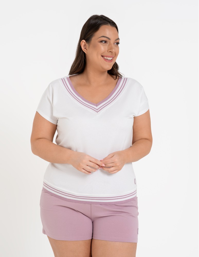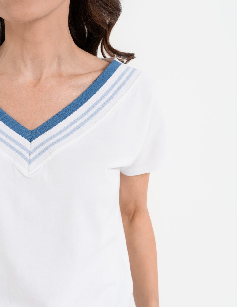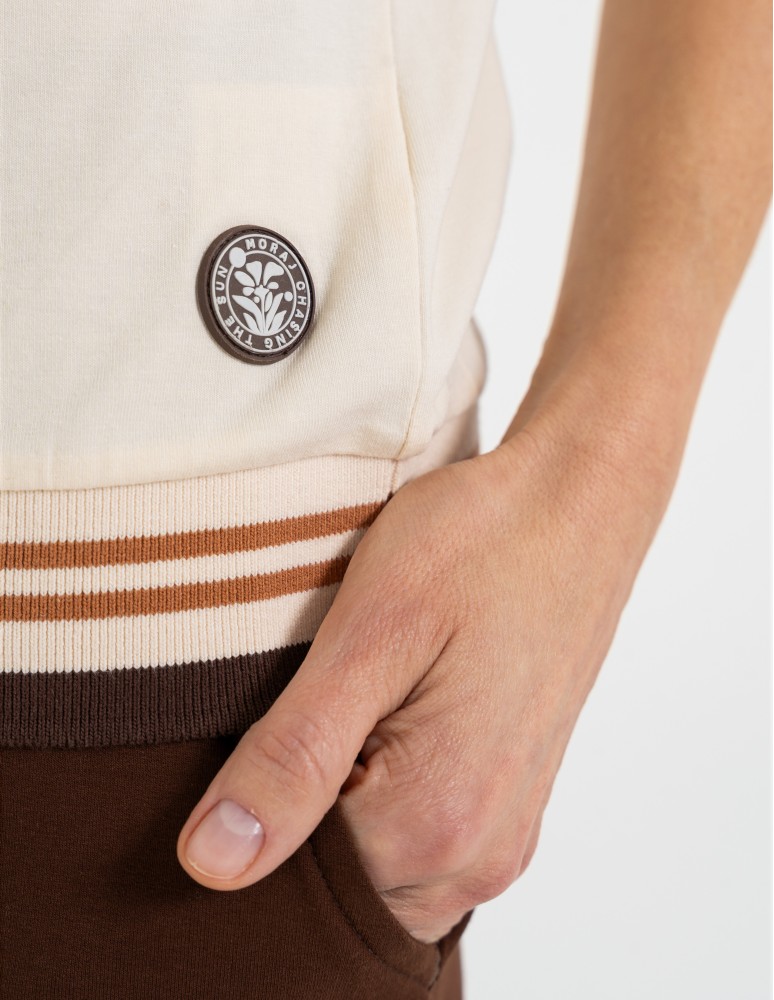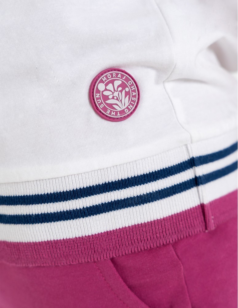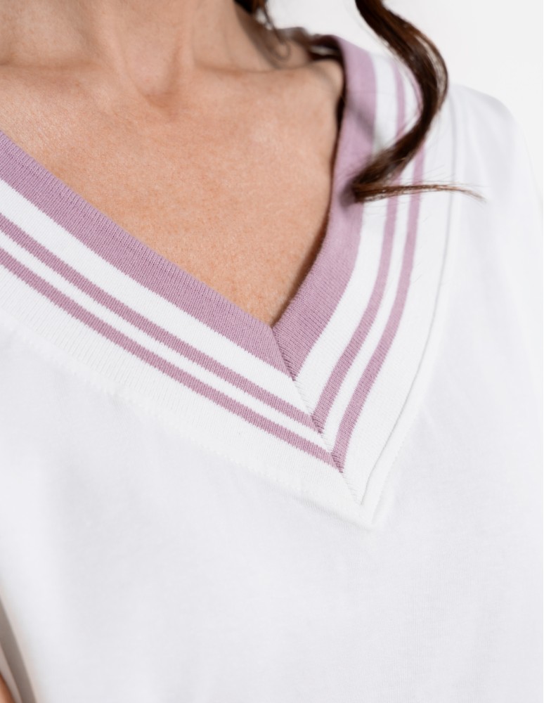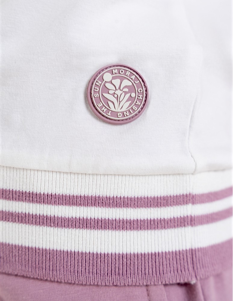 Damska bluzka o swobodnym kroju, która łączy sportową dynamikę z codzienną elegancją. Uwagę przyciąga efektowny dekolt w kształcie litery V, wykończony szerokim, elastycznym ściągaczem z kontrastowymi paskami. Podobny detal znajduje się na dole bluzki, co nadaje całości spójny, nowoczesny wygląd. Subtelna, okrągła naszywka z motywem roślinnym umieszczona nad dolnym ściągaczem stanowi estetyczne dopełnienie projektu.