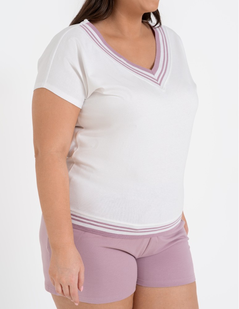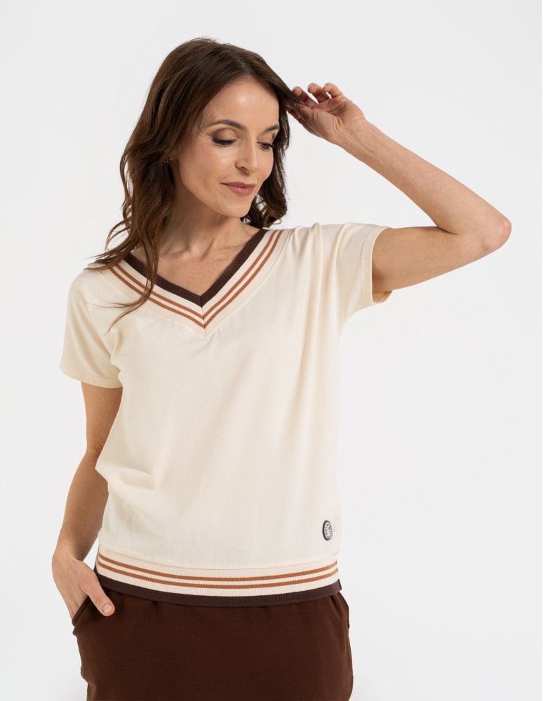 Bluzka damska bawełniana z krótkim rękawem i dekoltem V BEŻOWY
