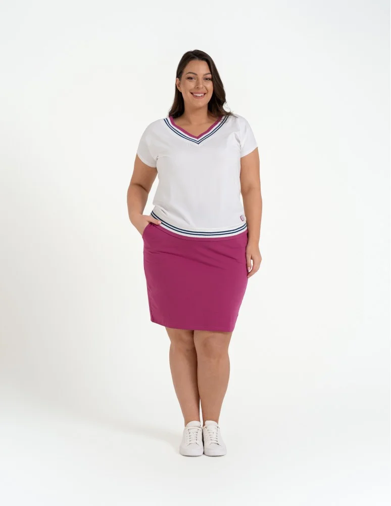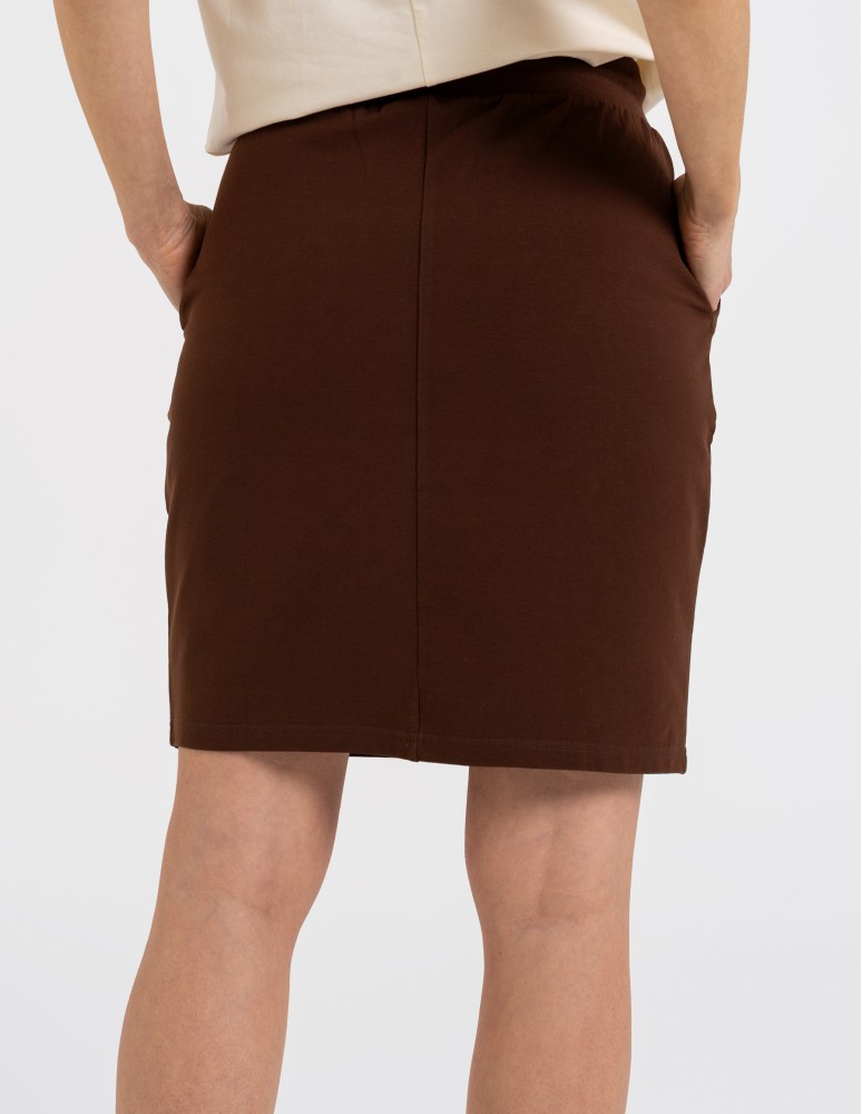 Funkcjonalna konstrukcja z elastycznym pasem oraz dodatkową regulacją na sznurek pozwala na idealne dopasowanie do sylwetki. Praktyczne, wsuwane kieszenie po bokach zwiększają użyteczność spódnicy, a dopracowane szwy zapewniają trwałość i stabilność formy. Optymalna długość oraz miękkie wykończenie krawędzi gwarantują pełną swobodę ruchów bez ucisku.