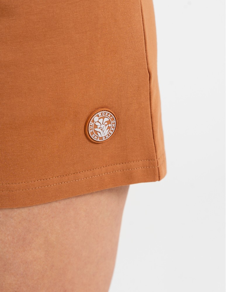 Damska spódnica o sportowym charakterze to idealne połączenie wygody i kobiecego stylu. Prosta, minimalistyczna forma została urozmaicona subtelną, okrągłą naszywką z motywem roślinnym umieszczoną na dole, która nadaje całości unikalnego wyrazu. Estetyczne wykończenie i klasyczny fason sprawiają, że produkt prezentuje się lekko i nowocześnie, pasując do wielu codziennych stylizacji.