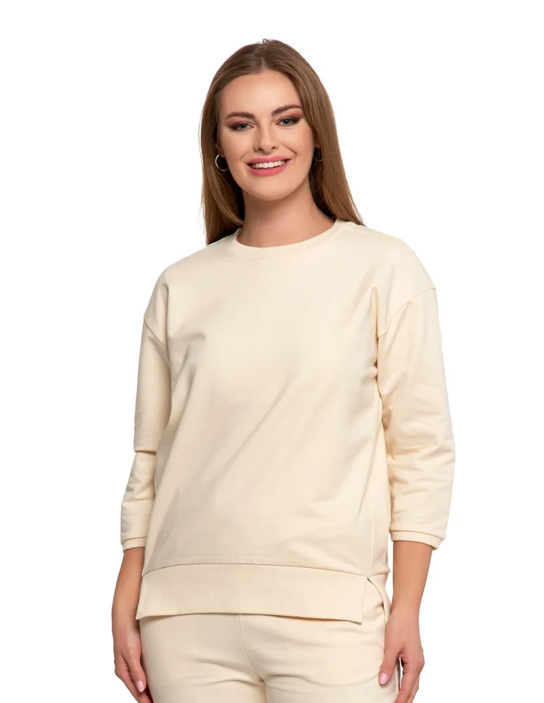 Bluza dresowa damska z rękawem 3/4 i rozcięciem po bokach KREMOWY