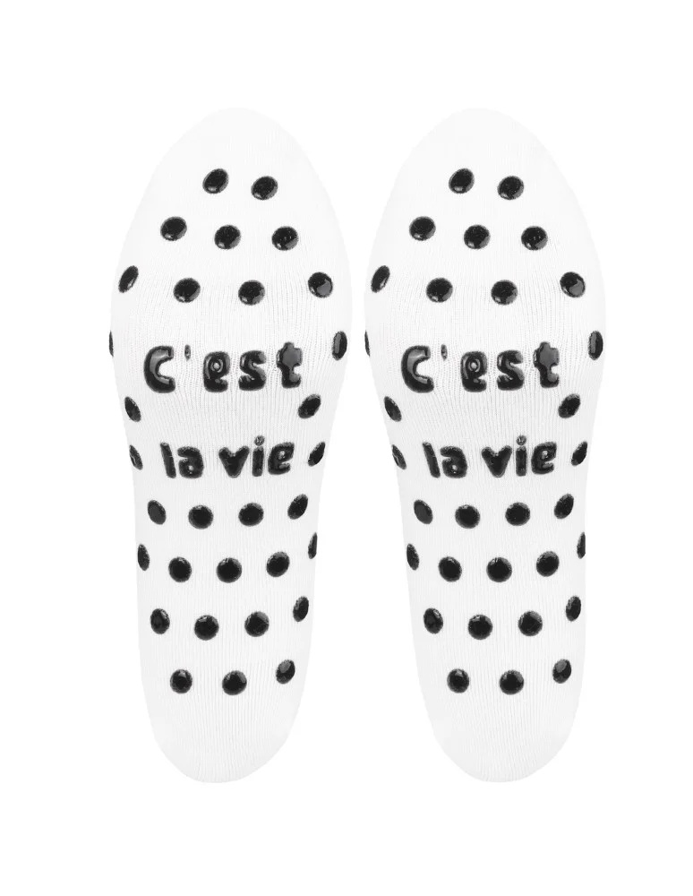 Antypoślizgowa podeszwa z silikonowymi wypustkami i napisami (ABS) gwarantuje stabilność na śliskich powierzchniach, idealne do domu, na jogę, pilates czy relaks w chłodniejsze dni. Stylowe nadruki i dekoracyjne napisy dodają im charakteru i sprawiają, że są świetnym pomysłem na prezent.