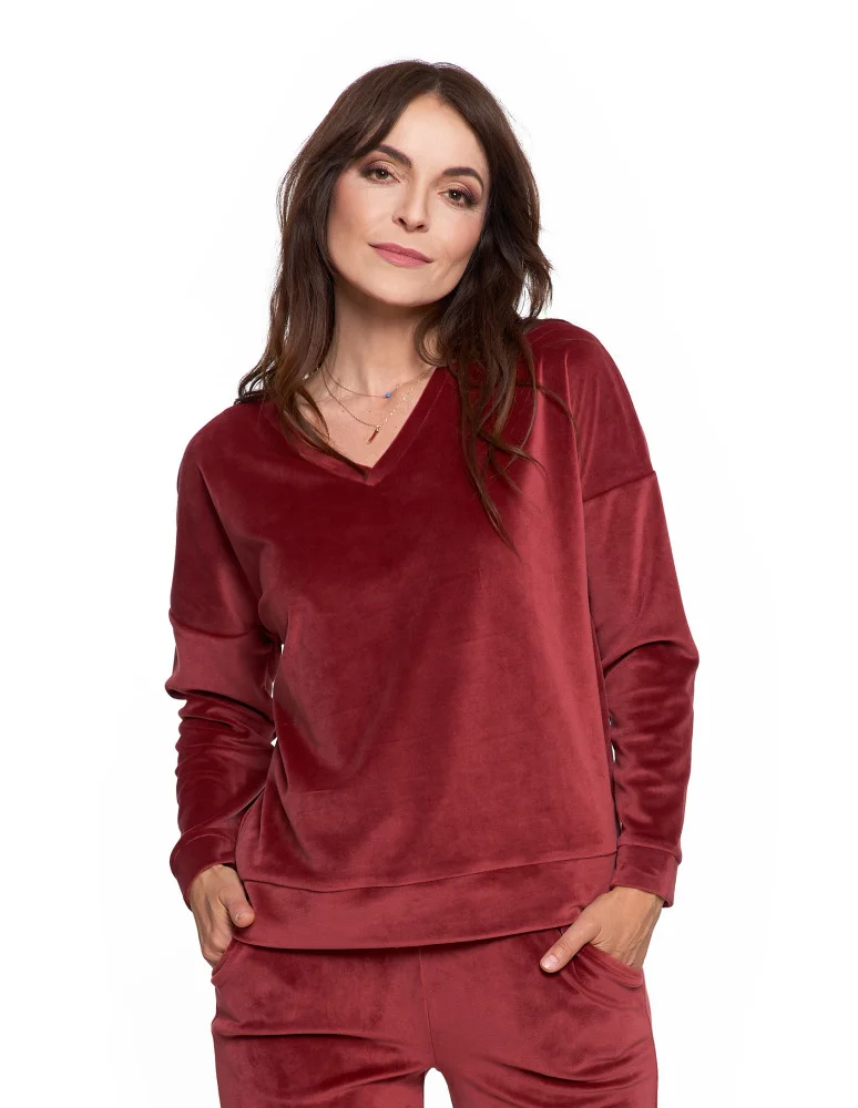 Bluza damska welurowa klasyczna z dekoltem V BORDOWY