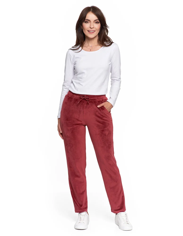 Spodnie damskie welurowe z wysokim stanem i prostą nogawką BORDOWY