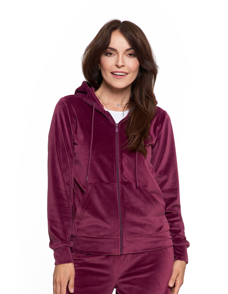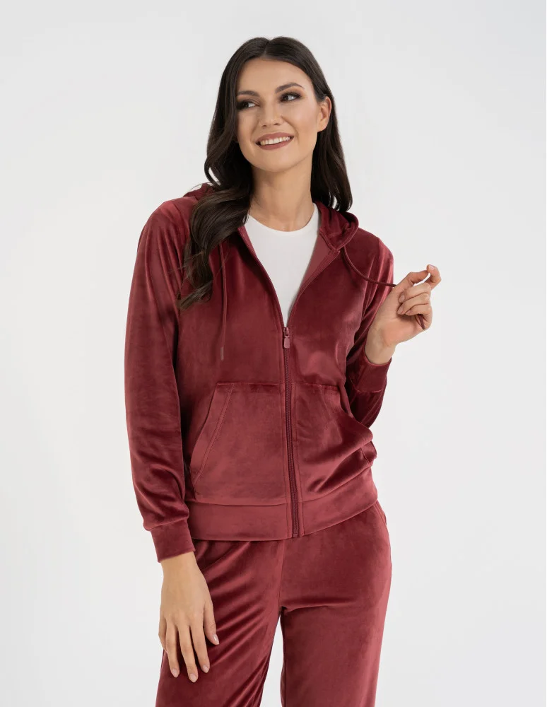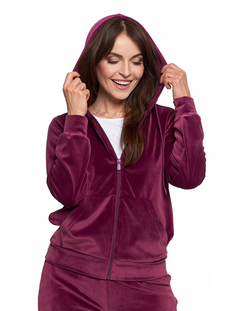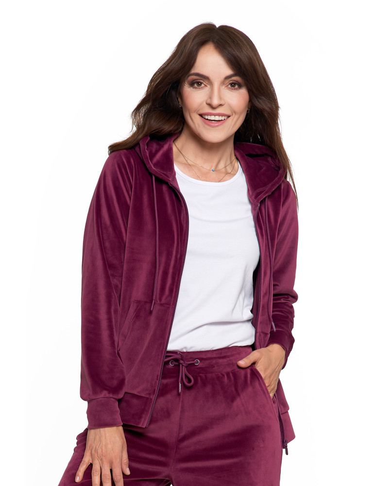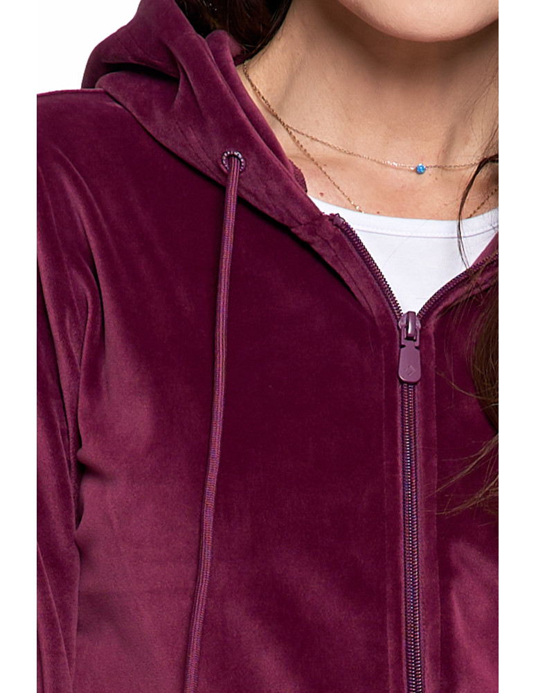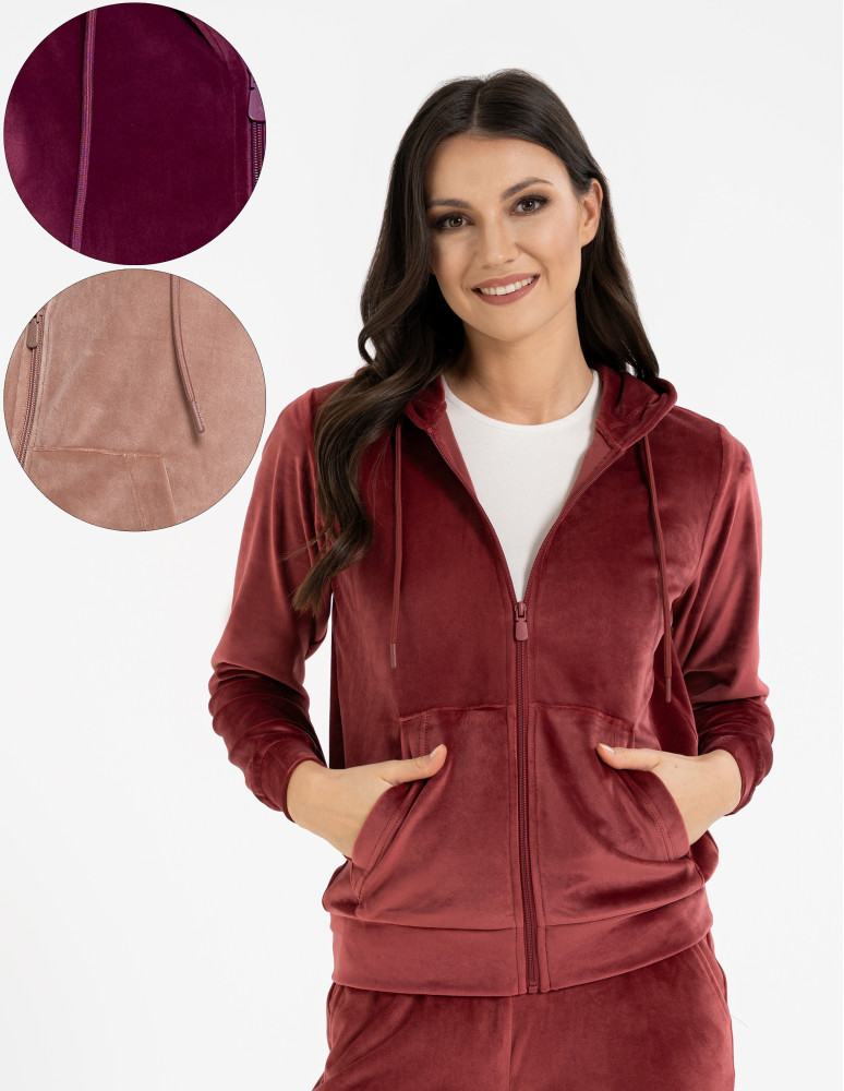 Bluza damska welurowa rozpinana z kapturem i kieszeniami BORDOWY