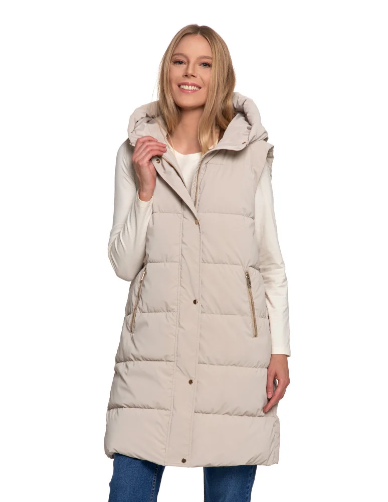 Długa kamizelka damska pikowana z kapturem BEŻOWY
