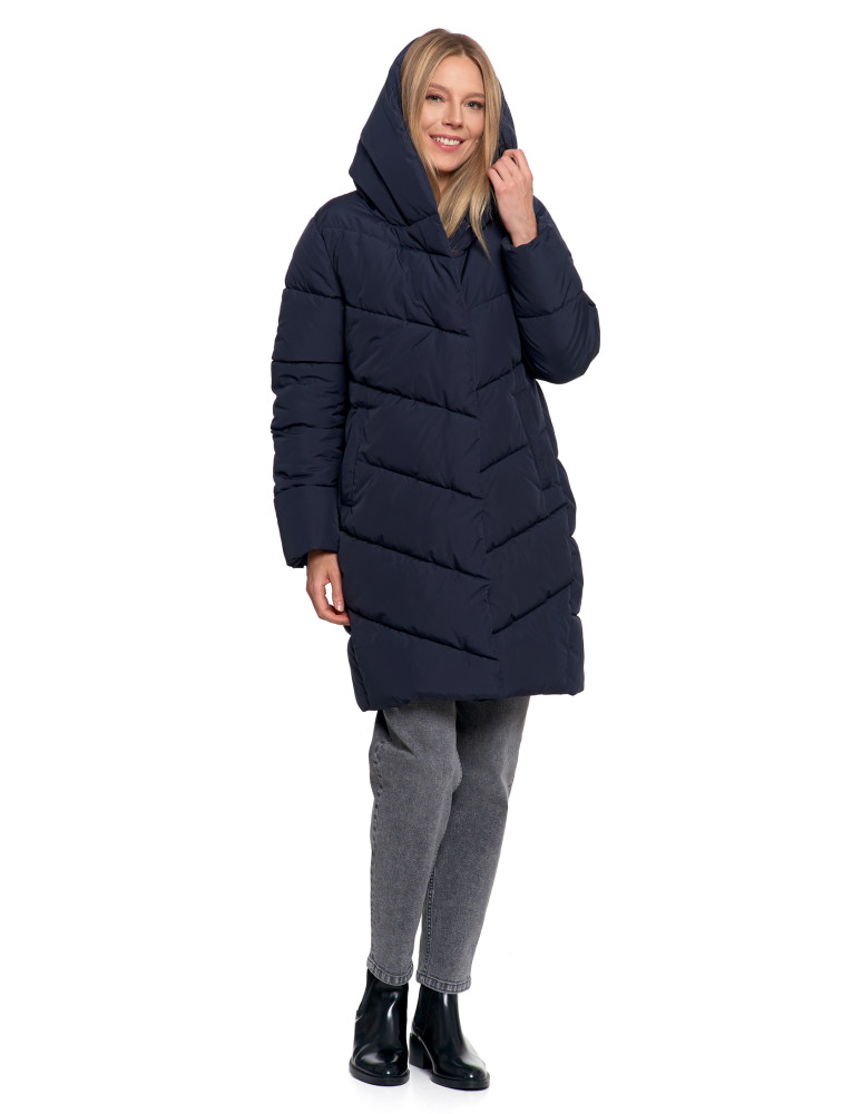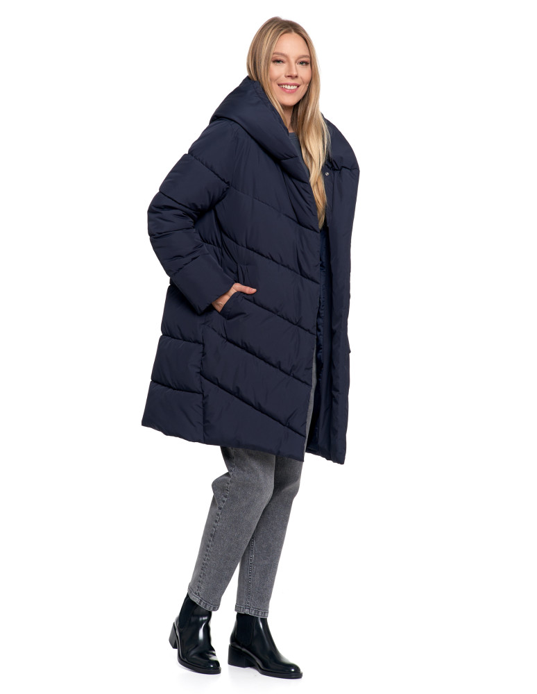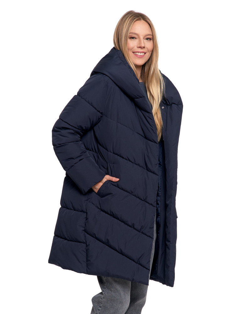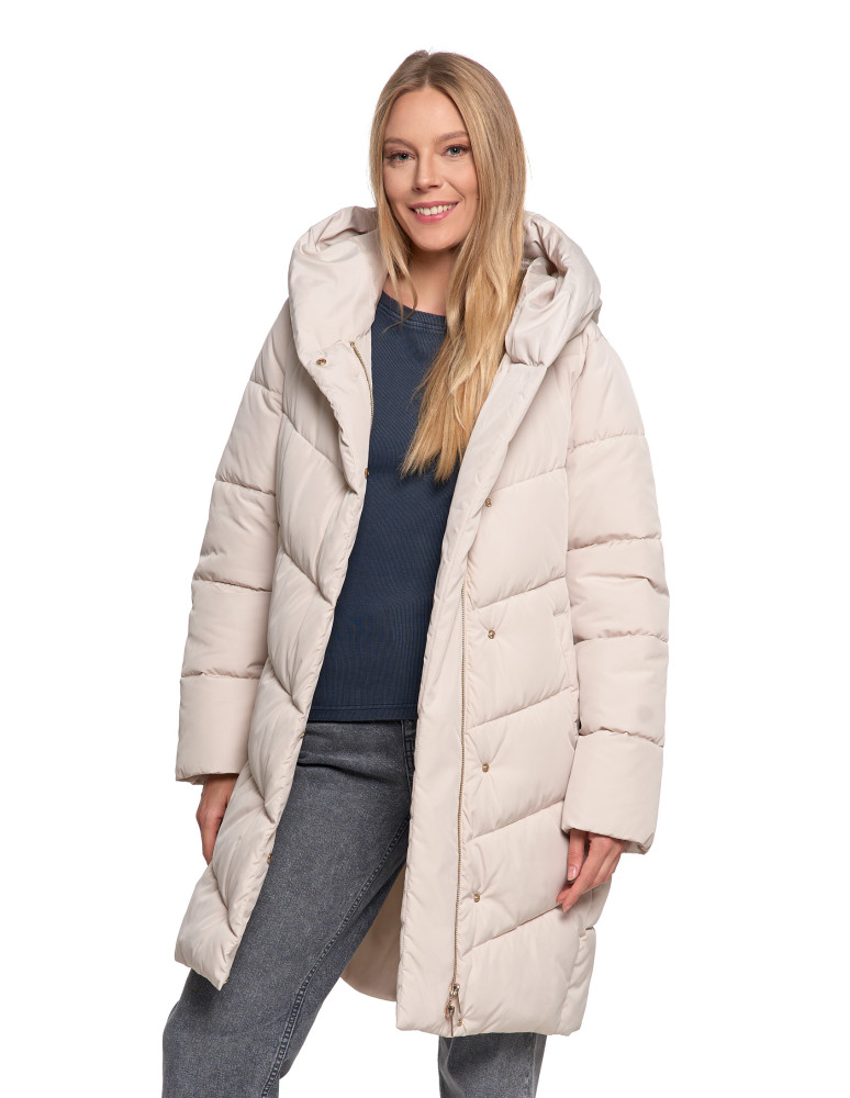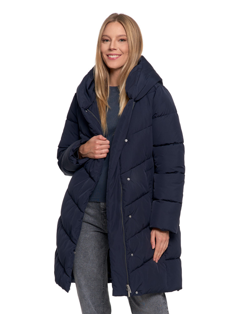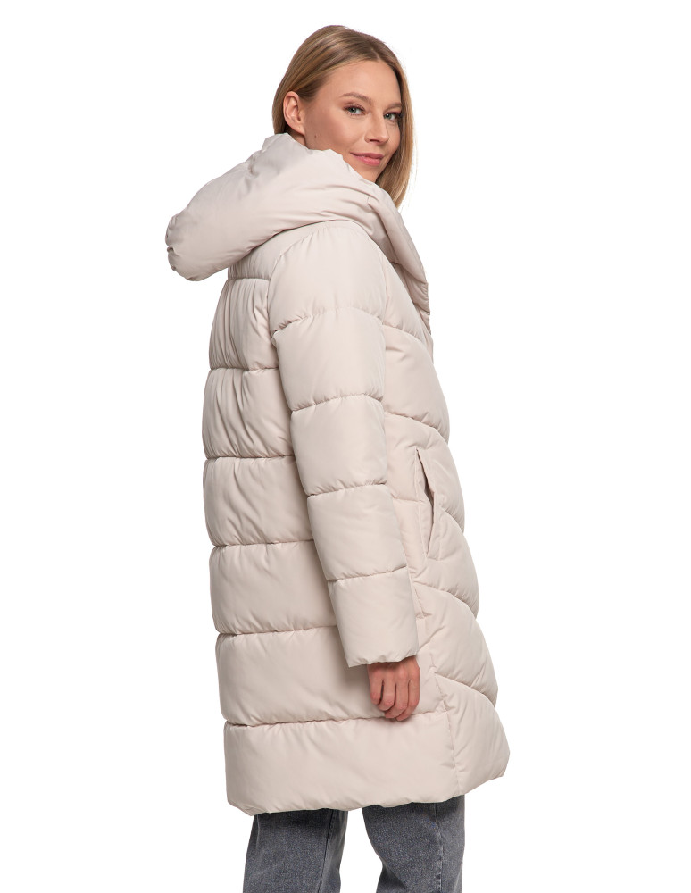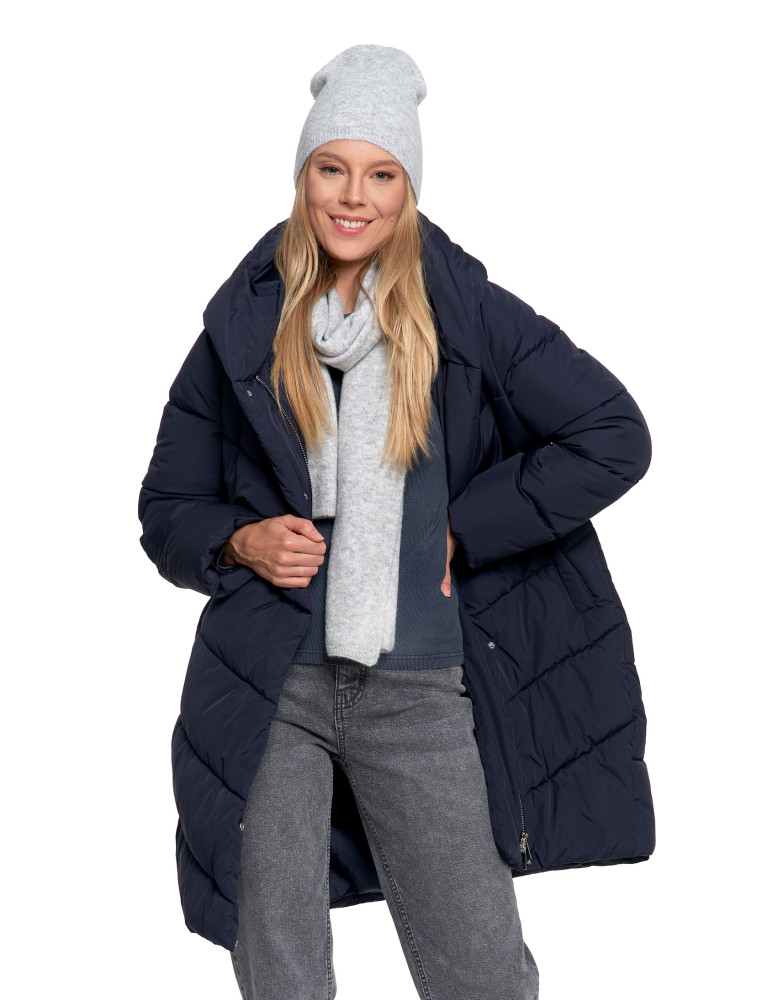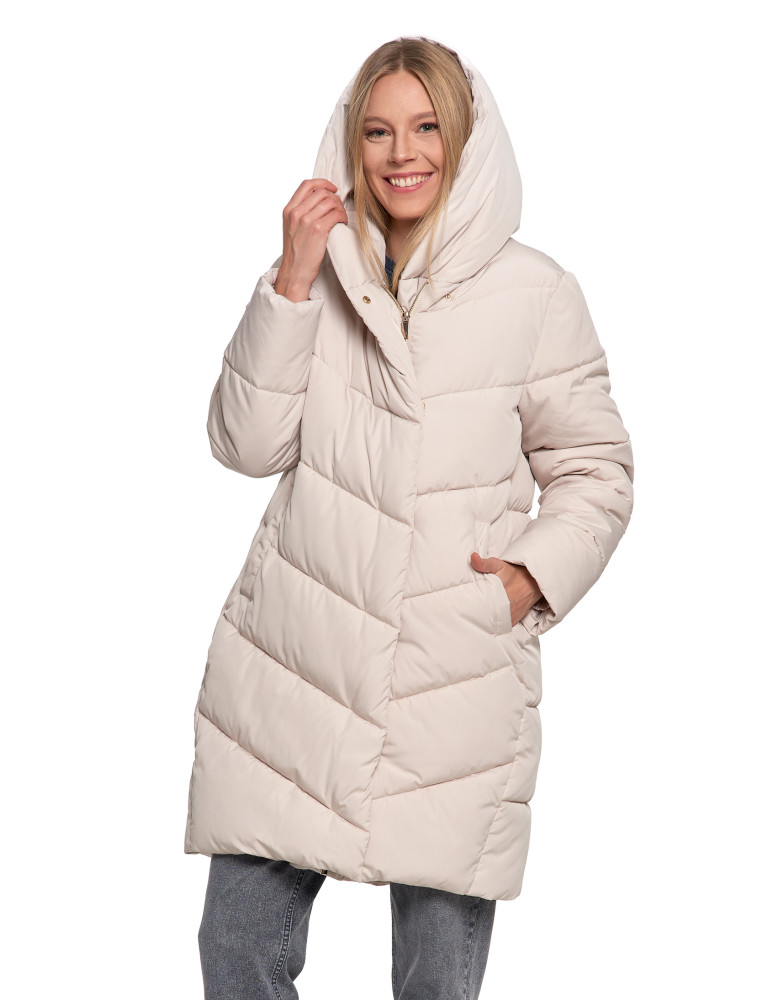 Płaszcz wyróżnia się modnym pikowaniem, które nadaje mu nowoczesnego charakteru. Jego największym atutem jest obszerny kaptur, który skutecznie chroni przed wiatrem i śniegiem. Krój jest lekko oversize’owy, co pozwala na swobodne noszenie grubych swetrów.