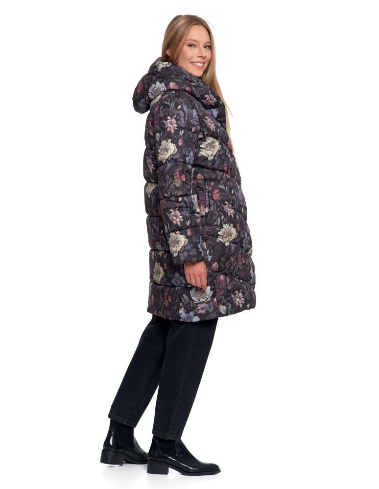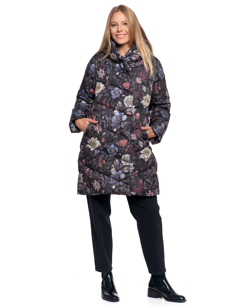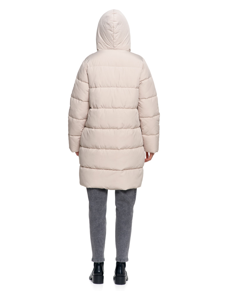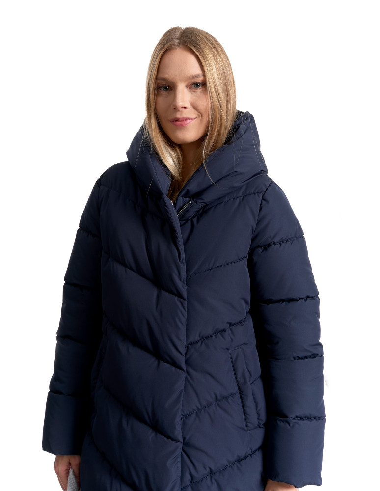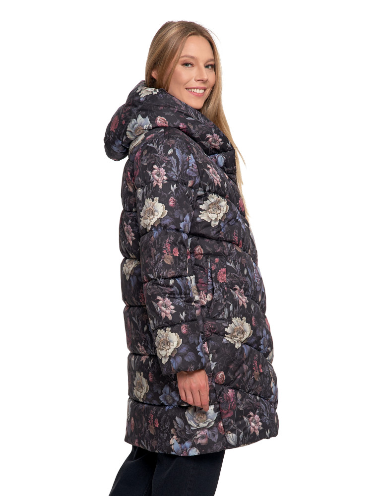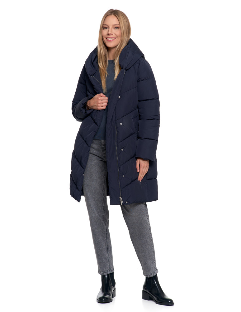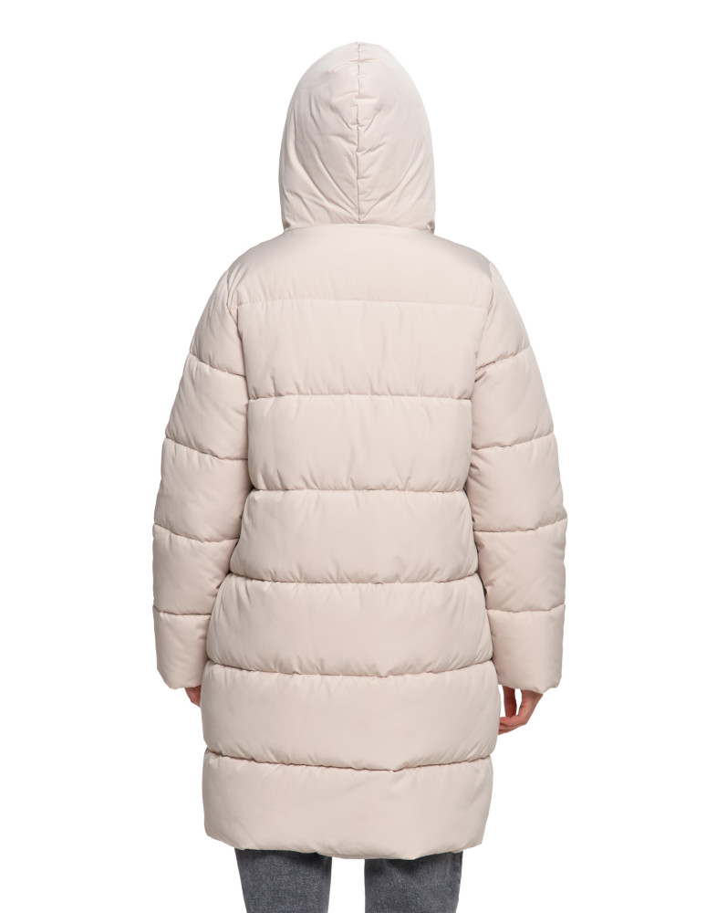 Płaszcz wyróżnia się modnym pikowaniem, które nadaje mu nowoczesnego charakteru. Jego największym atutem jest obszerny kaptur, który skutecznie chroni przed wiatrem i śniegiem. Krój jest lekko oversize’owy, co pozwala na swobodne noszenie grubych swetrów.