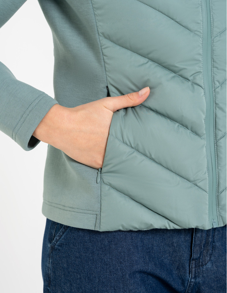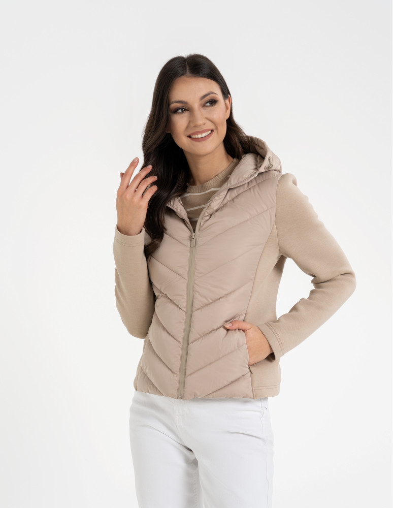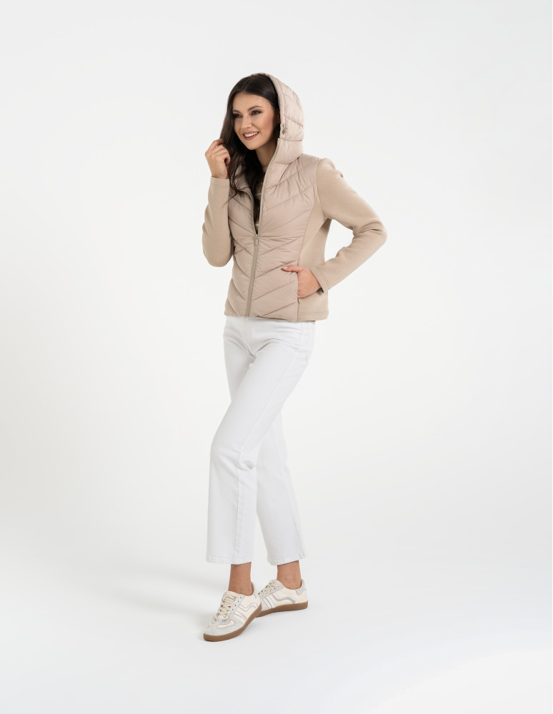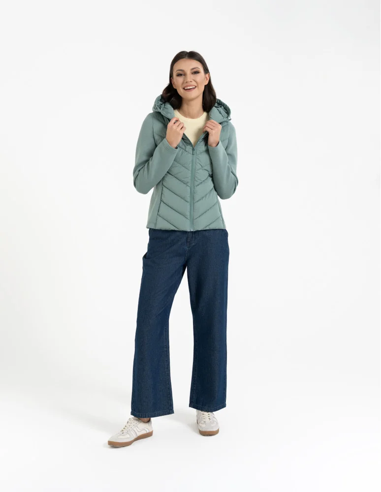 Damska kurtka przejściowa z kapturem to idealne połączenie sportowej funkcjonalności i miejskiego stylu. Pikowany przód oraz tył zapewniają ochronę przed chłodem, a elastyczne, miękkie rękawy i boki gwarantują pełną swobodę ruchów i wygodę w każdej sytuacji.