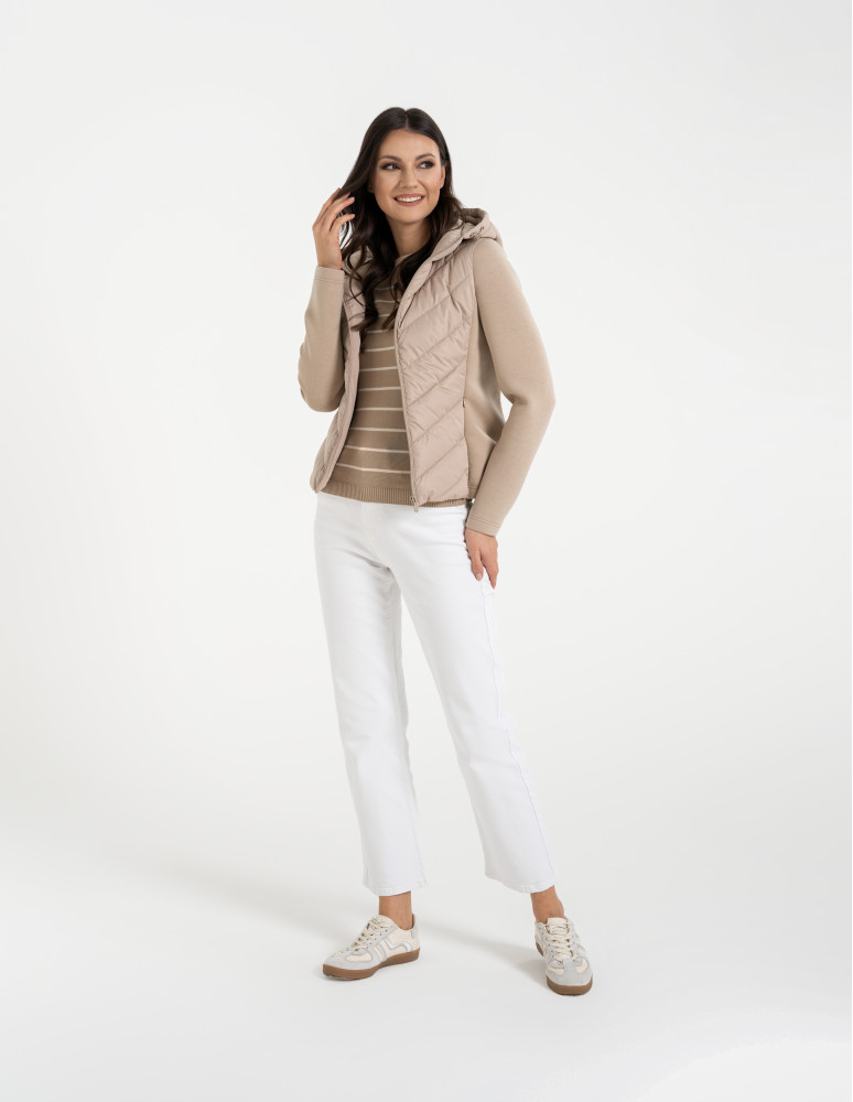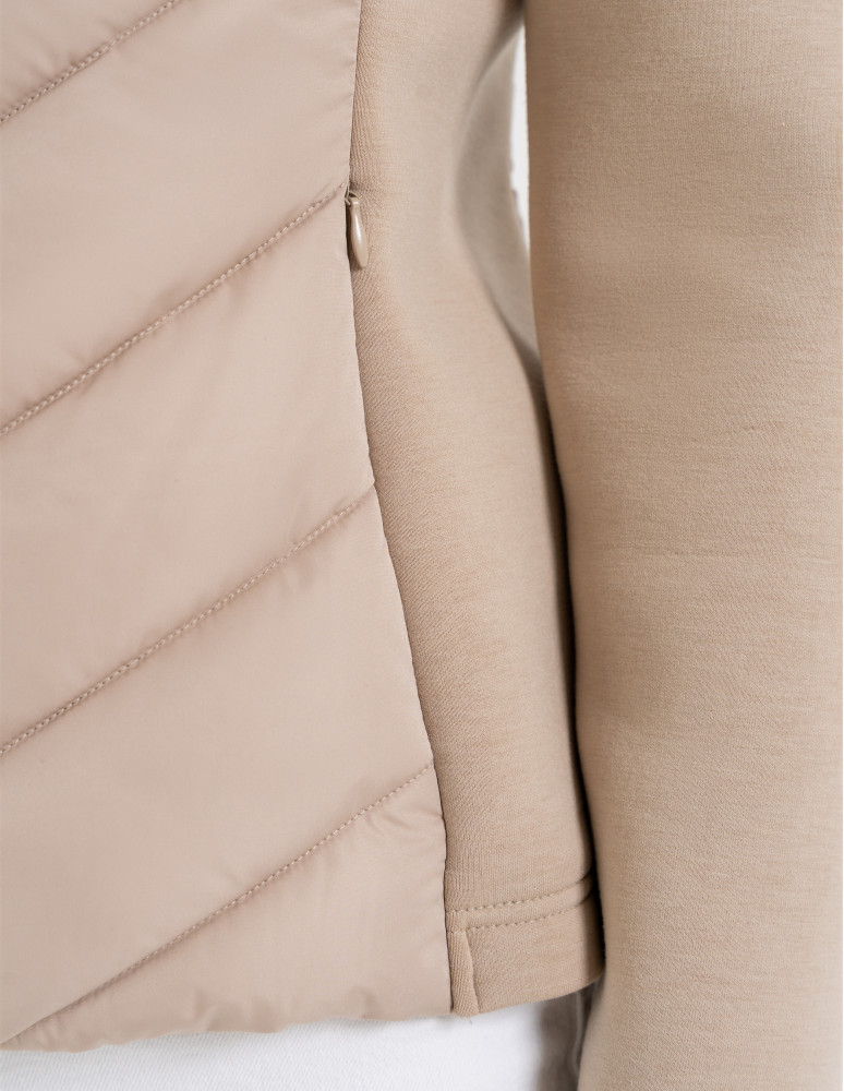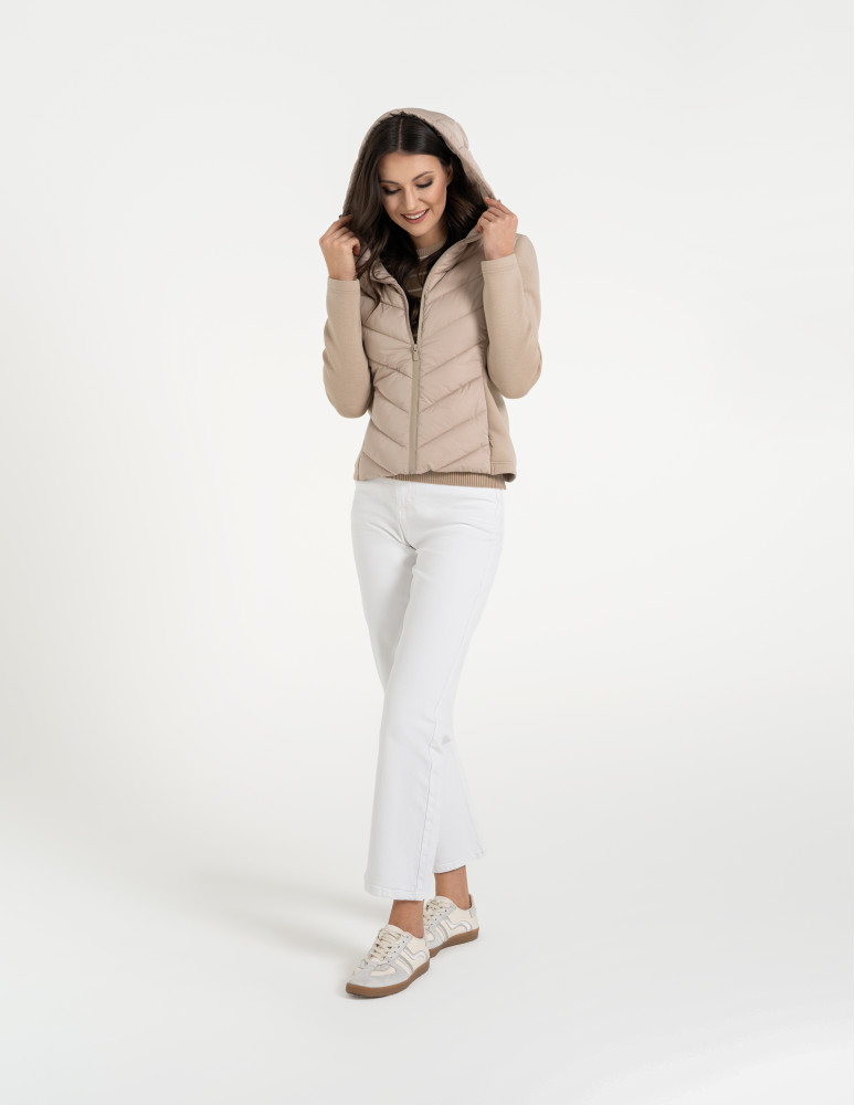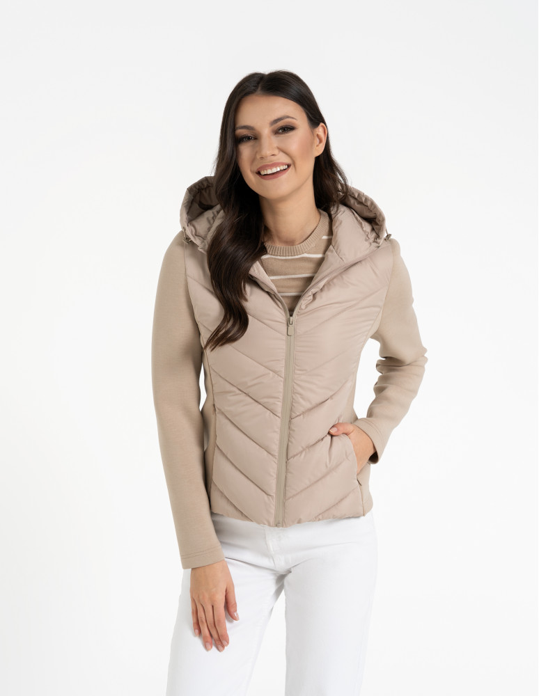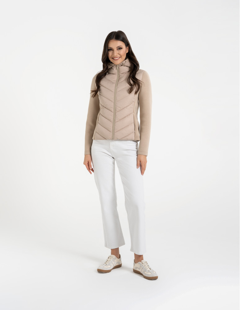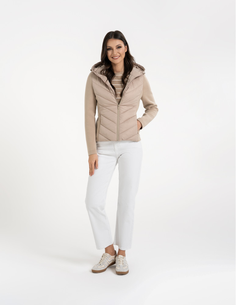 - Hybrydowa konstrukcja – połączenie pikowanego korpusu i miękkich rękawów