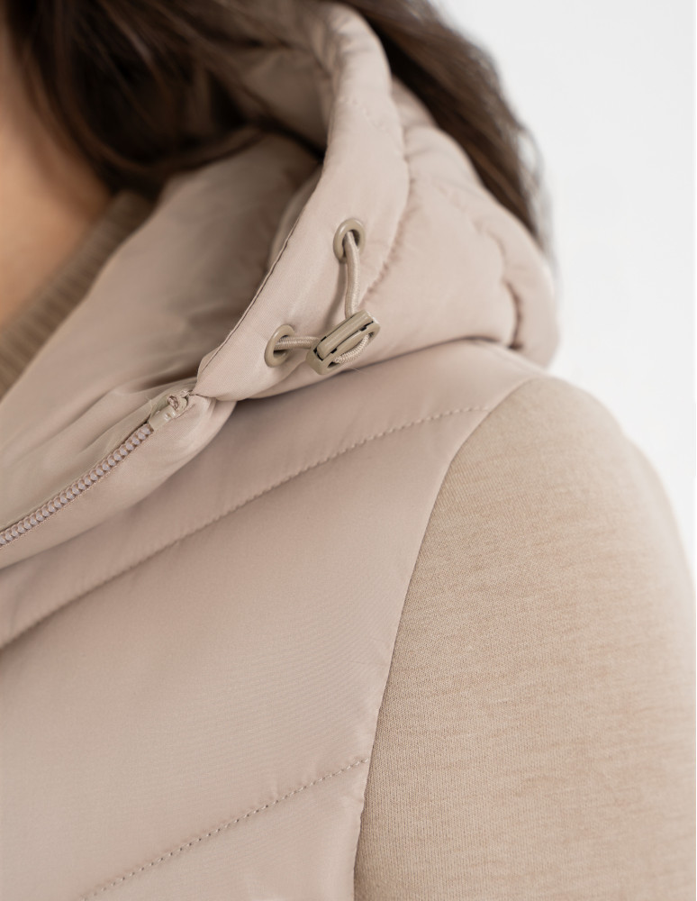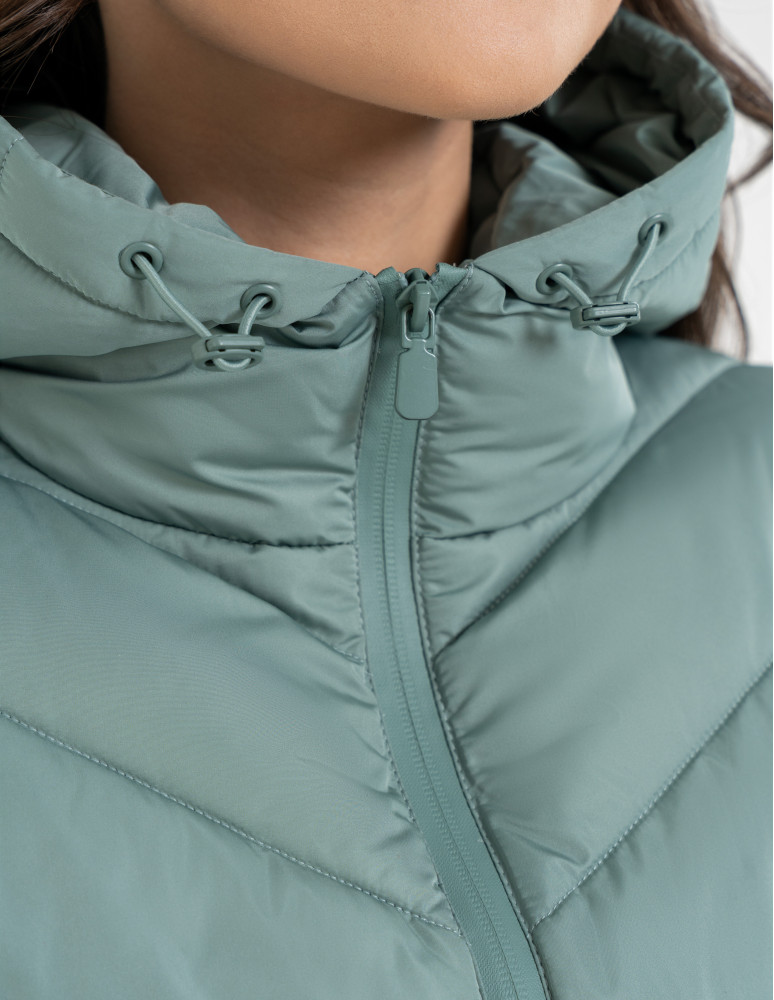 Model wyposażony jest w praktyczny kaptur z regulacją, który skutecznie osłania przed wiatrem i deszczem. Zamek błyskawiczny na całej długości ułatwia zakładanie, a smukłe przeszycia w jodełkę subtelnie modelują sylwetkę, podkreślając jej kobiecy kształt.