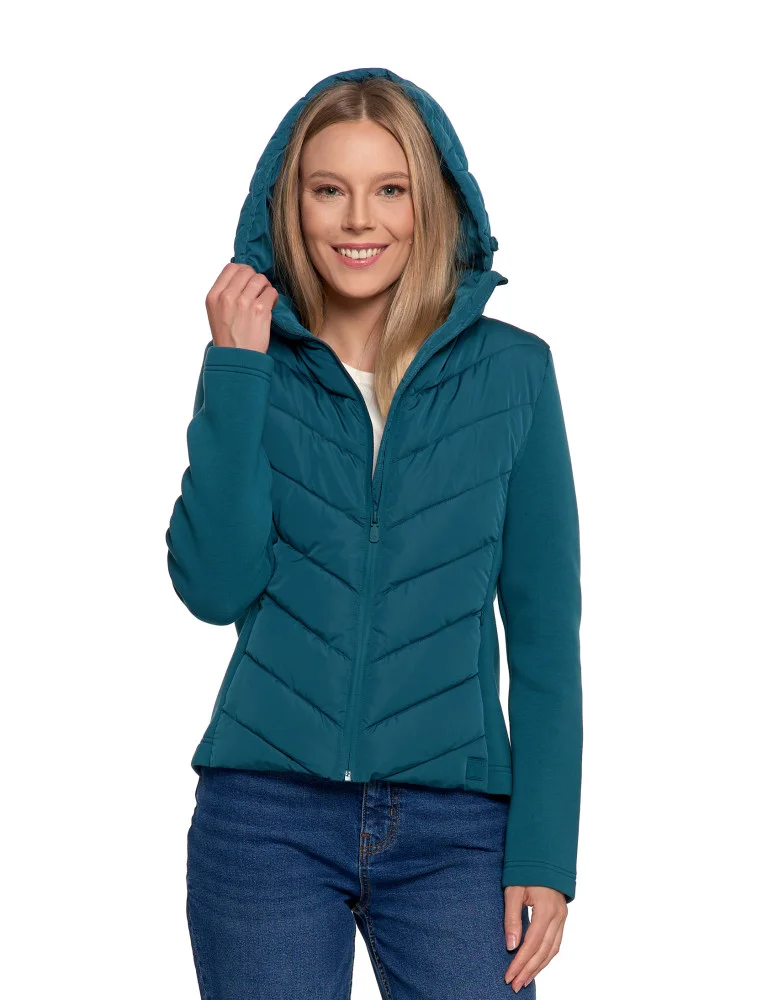 Damska kurtka przejściowa z kapturem to idealne połączenie sportowej funkcjonalności i miejskiego stylu. Pikowany przód oraz tył zapewniają ochronę przed chłodem, a elastyczne, miękkie rękawy i boki gwarantują pełną swobodę ruchów i wygodę w każdej sytuacji.