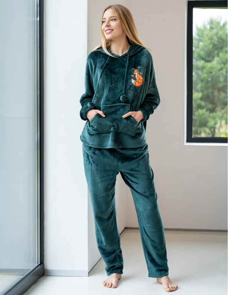 Ciepła piżama damska welurowa z liskiem i kapturem ZIELONY