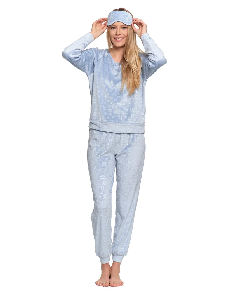 Piżama damska welurowa z długim rękawem i opaską na oczy NIEBIESKI
