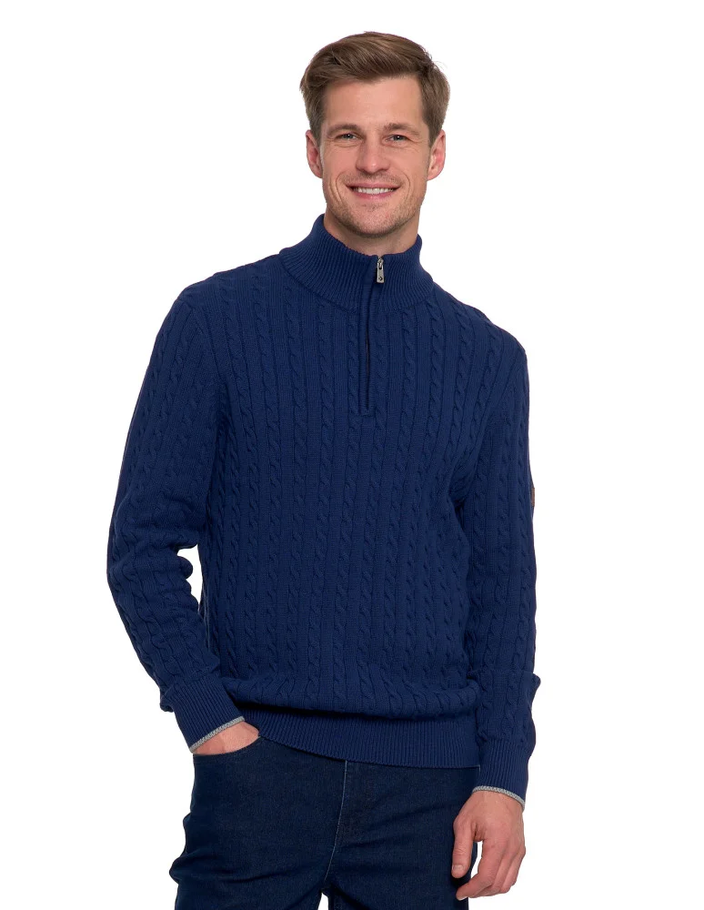 Model wyróżnia się półgolfem zapinanym na krótki zamek, który nadaje mu nowoczesnego charakteru i pozwala na różne sposoby stylizacji – od luźnych, codziennych zestawów po bardziej eleganckie outfity. Klasyczny splot w formie warkoczy dodaje całości ponadczasowego uroku, a ściągacze przy rękawach i dole swetra dbają o idealne dopasowanie i wygodę.