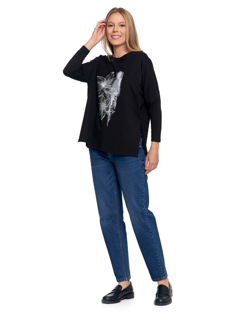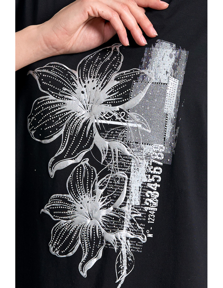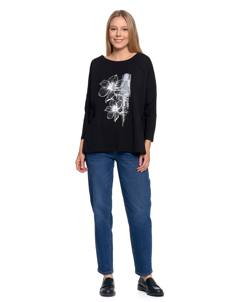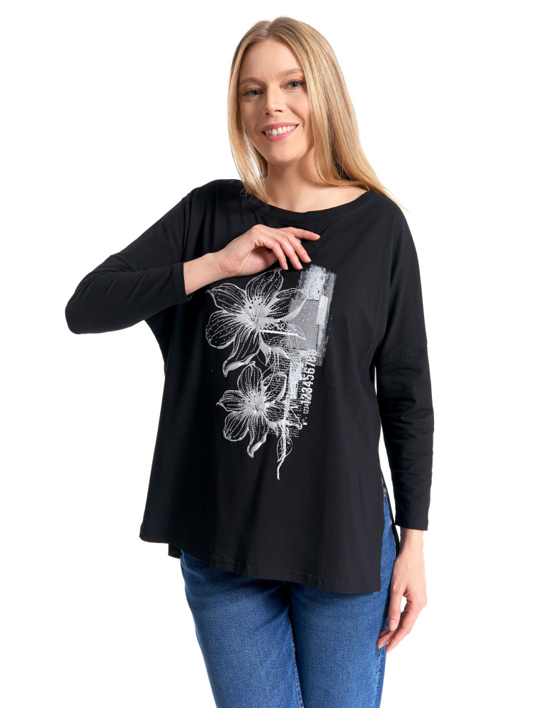 Bluzka damska bawełniana z nadrukiem kwiatowym i rękawem 3/4 CZARNY