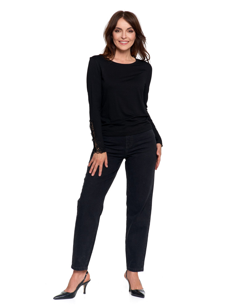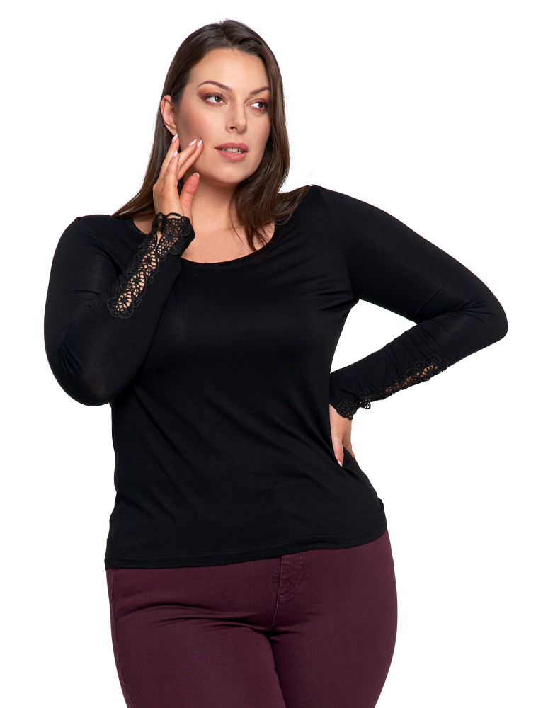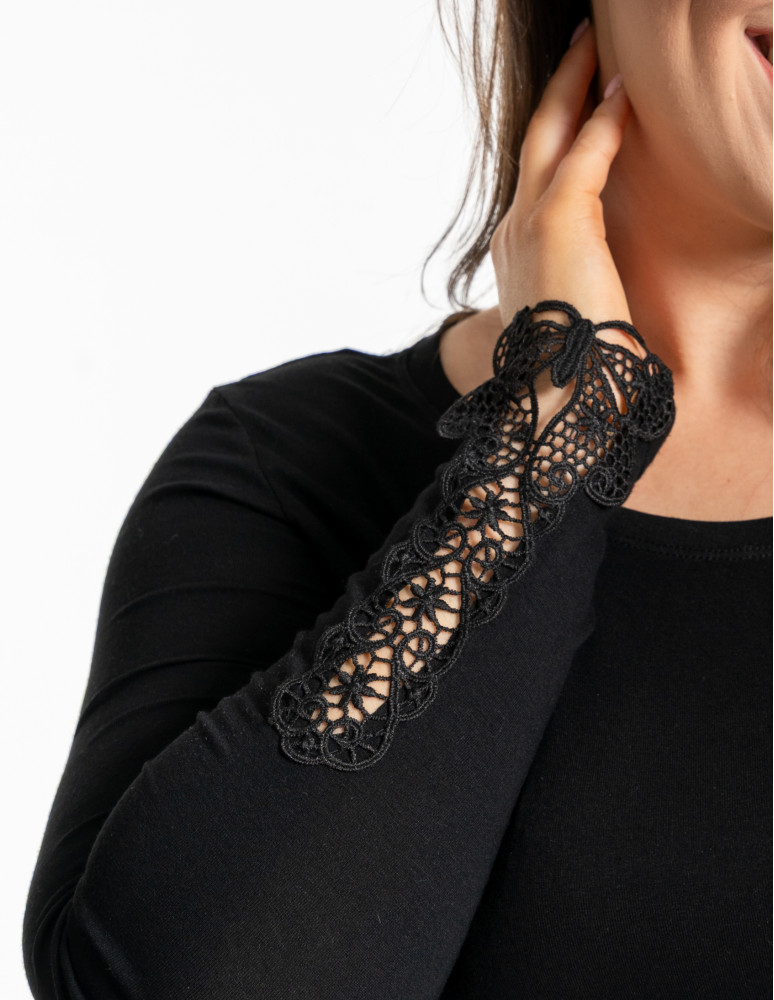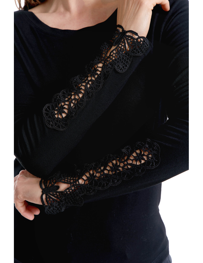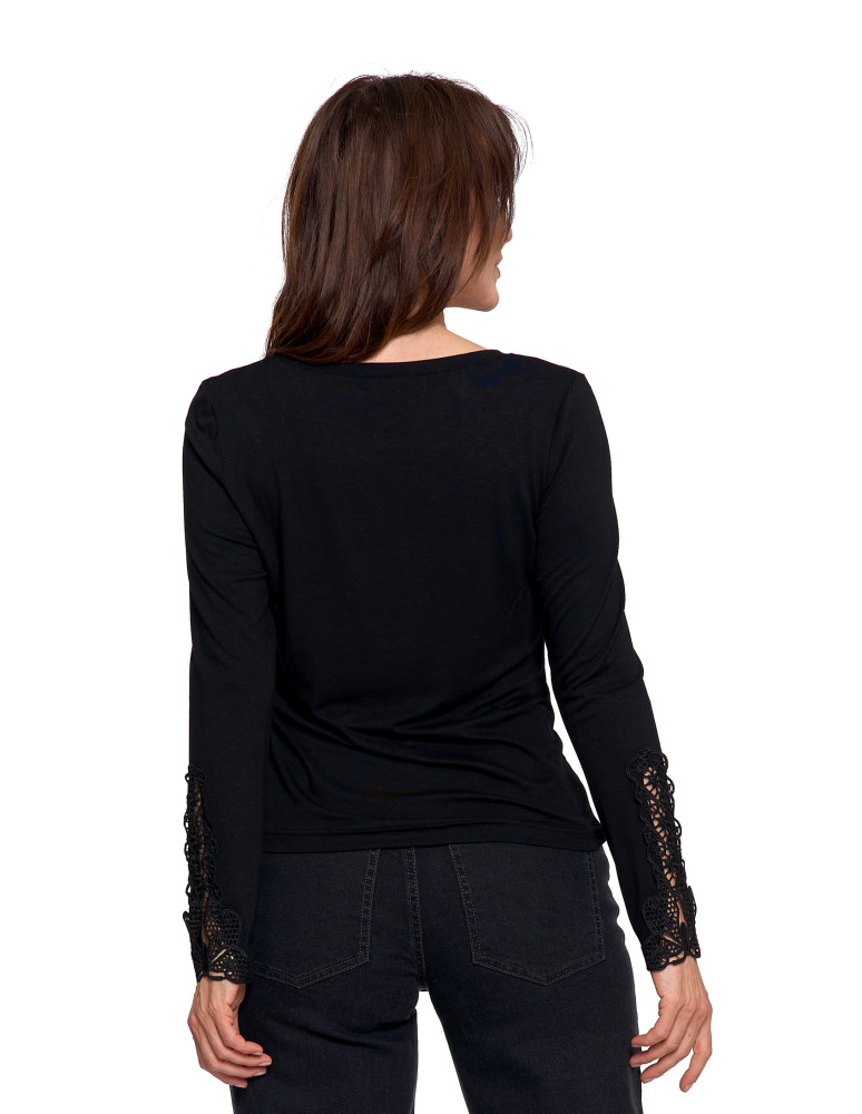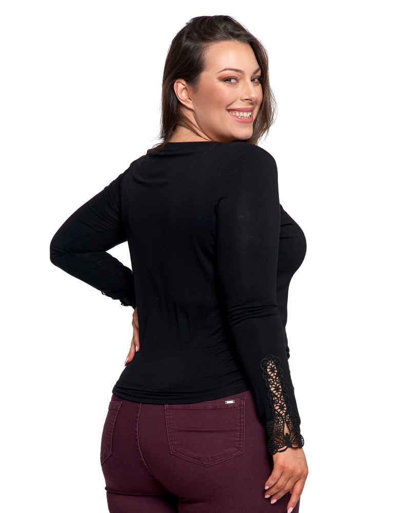 Bluzka damska z długim rękawem z wykończeniem koronkowym CZARNY