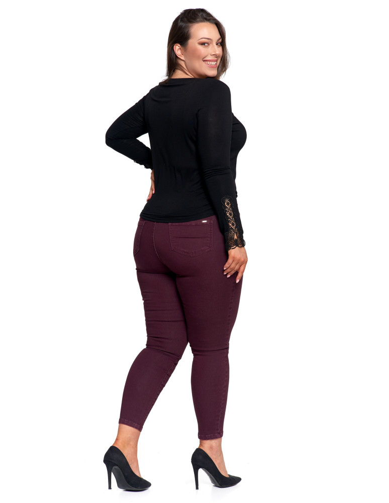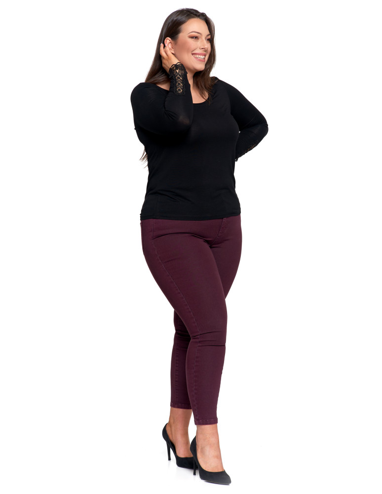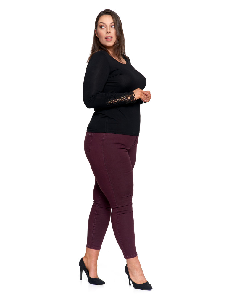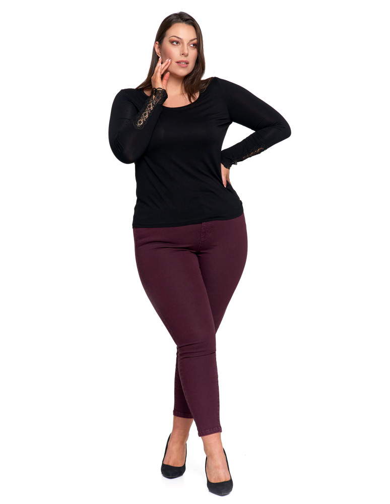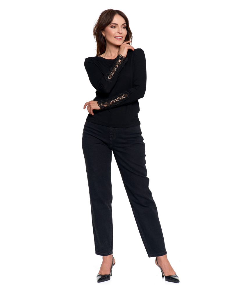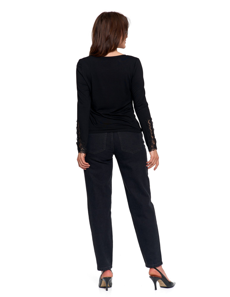Bluzka damska z długim rękawem z wykończeniem koronkowym CZARNY