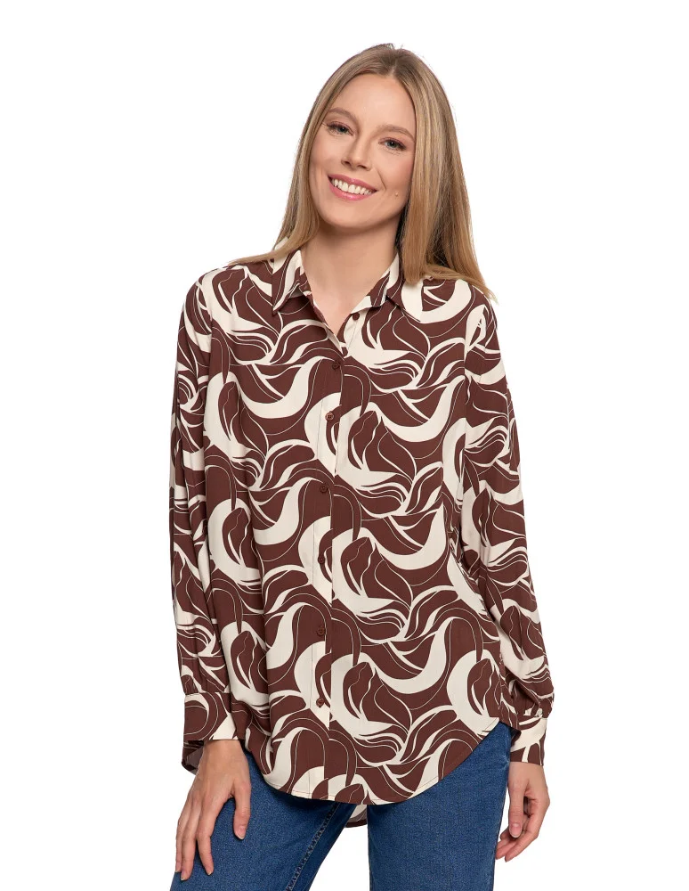 Koszula damska wiskozowa oversize z wydłużonym tyłem BRĄZOWY