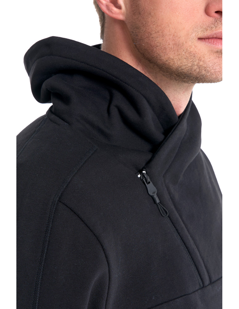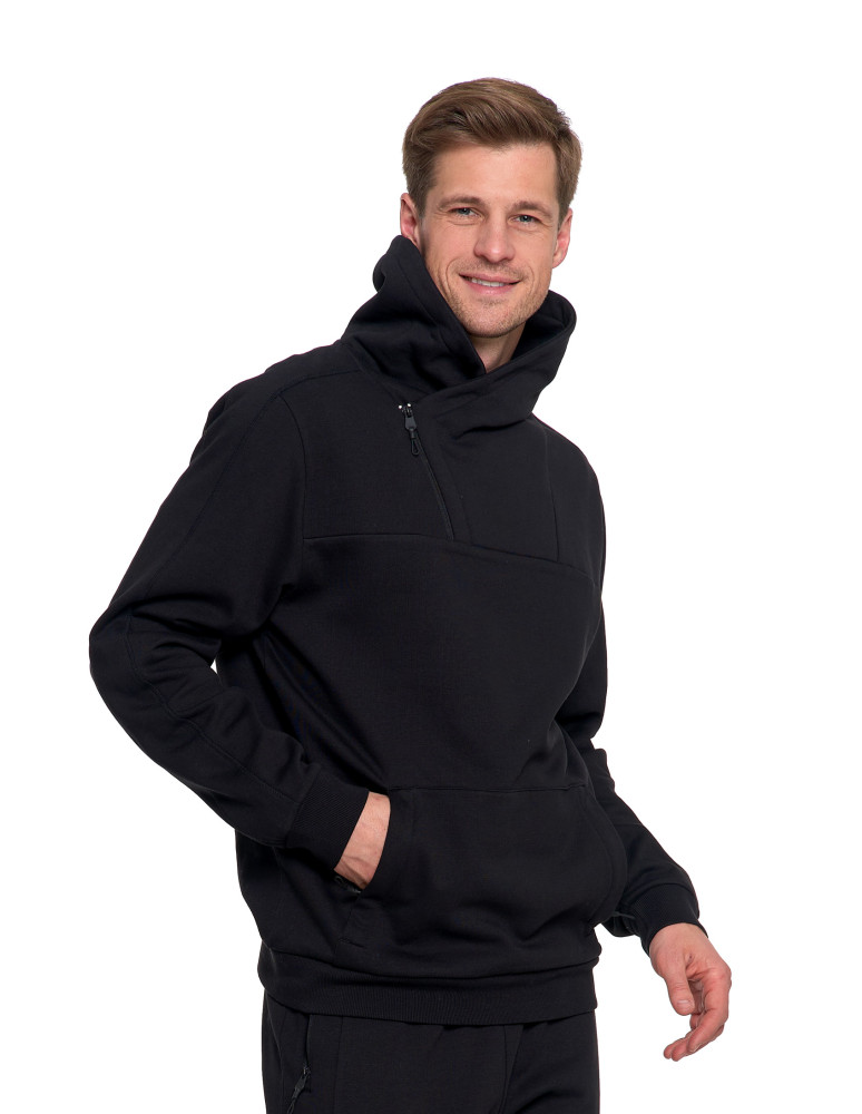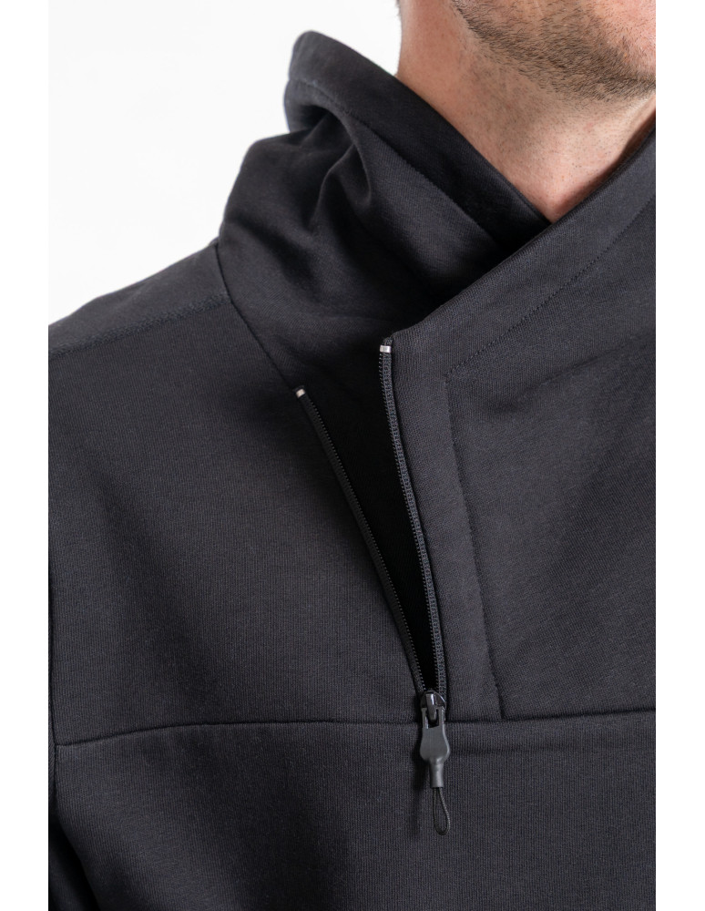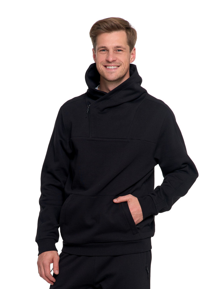 Bluza posiada innowacyjną, wysoką stójkę, która skutecznie chroni szyję przed wiatrem. Stójka jest częściowo rozpinana na zamek błyskawiczny, co pozwala na regulację i ułatwia zakładanie. Praktyczna kieszeń typu kangurka z przodu umożliwia ogrzanie dłoni lub przechowywanie drobiazgów. Rękawy i dół bluzy wykończono szerokimi ściągaczami, które gwarantują lepsze dopasowanie i utrzymują ciepło. Minimalistyczny design bez zbędnych wzorów sprawia, że bluza jest wszechstronna i doskonale pasuje do jeansów lub dresowych joggerów.
