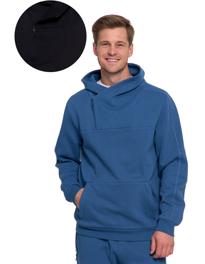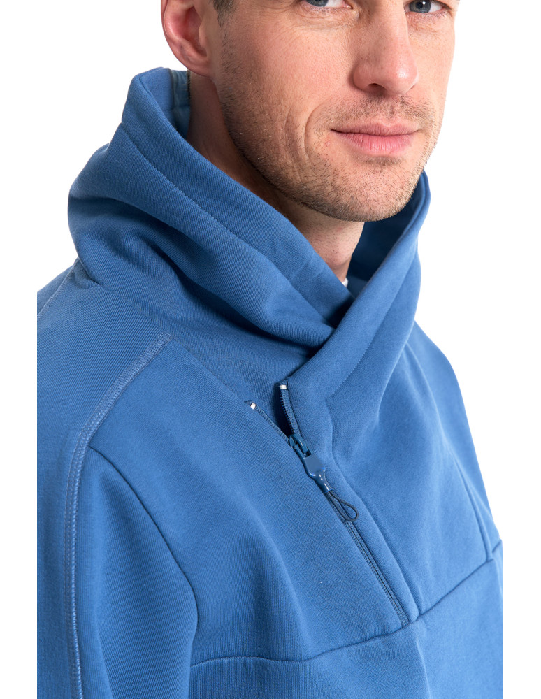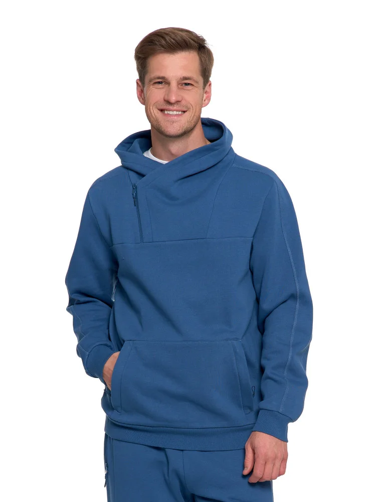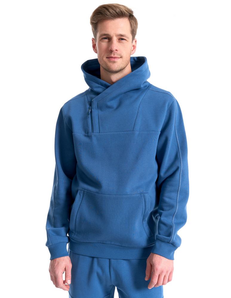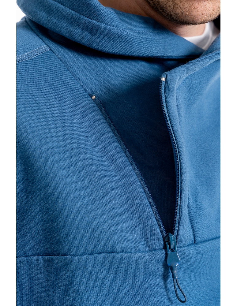 Bluza posiada innowacyjną, wysoką stójkę, która skutecznie chroni szyję przed wiatrem. Stójka jest częściowo rozpinana na zamek błyskawiczny, co pozwala na regulację i ułatwia zakładanie. Praktyczna kieszeń typu kangurka z przodu umożliwia ogrzanie dłoni lub przechowywanie drobiazgów. Rękawy i dół bluzy wykończono szerokimi ściągaczami, które gwarantują lepsze dopasowanie i utrzymują ciepło. Minimalistyczny design bez zbędnych wzorów sprawia, że bluza jest wszechstronna i doskonale pasuje do jeansów lub dresowych joggerów.