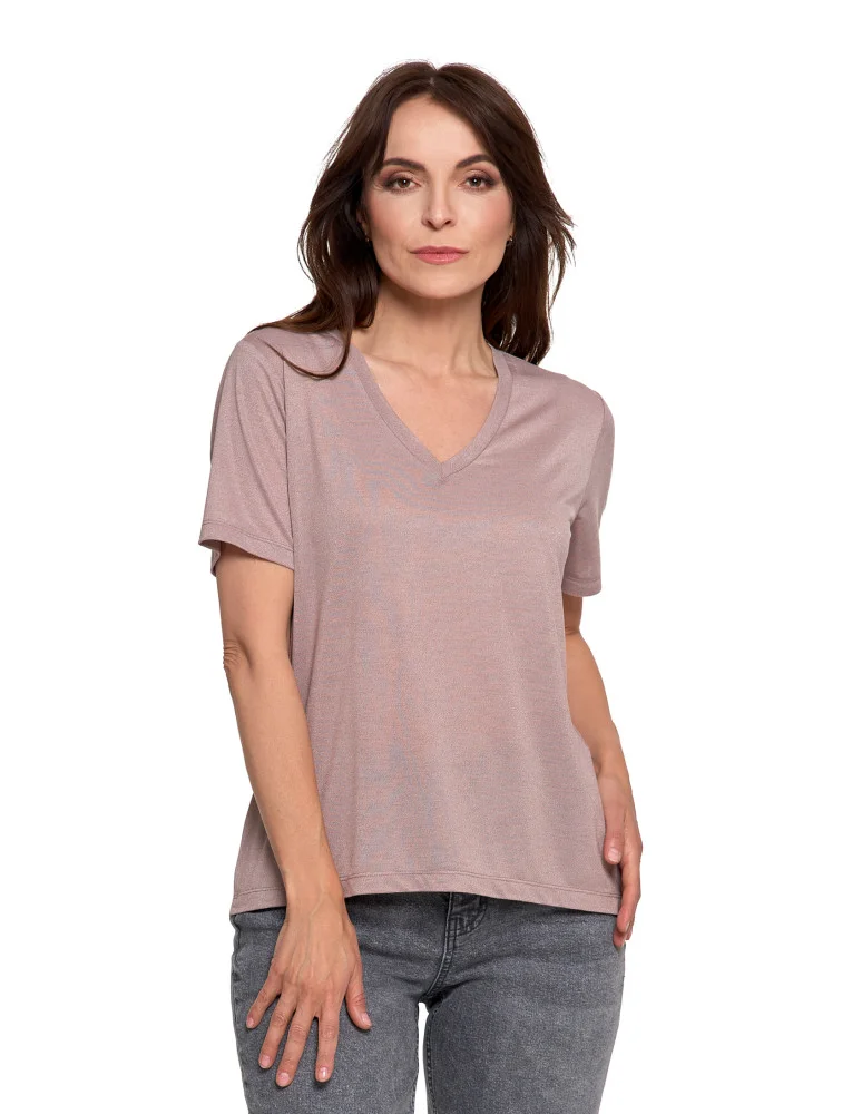 Damska bluzka z krótkim rękawem z metalizowaną nitką BEŻOWY