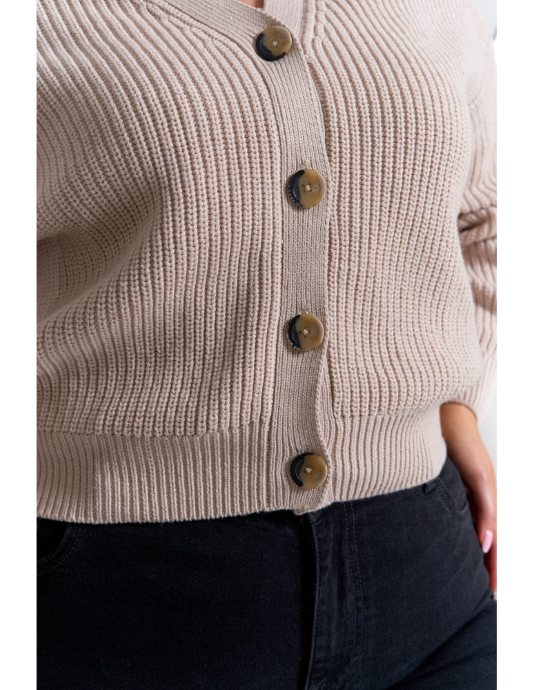 Damski sweter typu kardigan z zapięciem na duże guziki, o długości do bioder i lekko skróconej, pudełkowej sylwetce; ma szerokie rękawy z obniżoną linią ramion, prążkowy splot oraz ściągacze przy mankietach i na dole, a dekolt V pięknie eksponuje warstwy pod spodem. Sweter wykonany z przyjemnej w dotyku dzianiny z przewagą bawełny z domieszką włókien zwiększających elastyczność i trwałość. Będzie świetnym wyborem do jeansów, spódnic i sukienek, nosząc go na co dzień i do biura, od wczesnej jesieni po wiosnę.