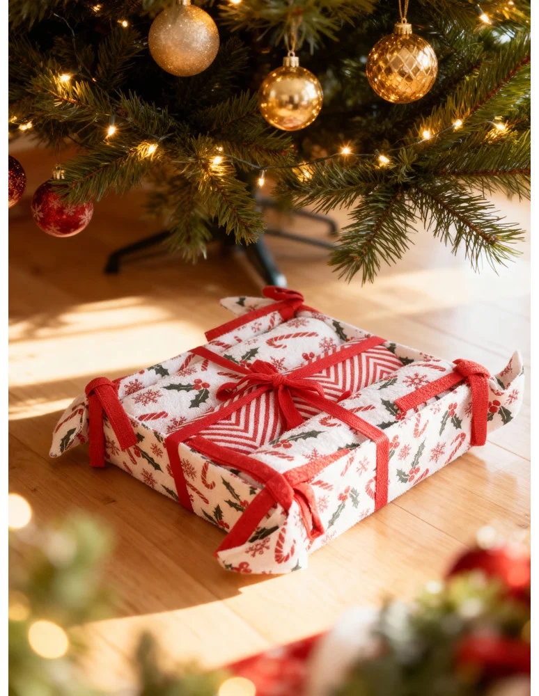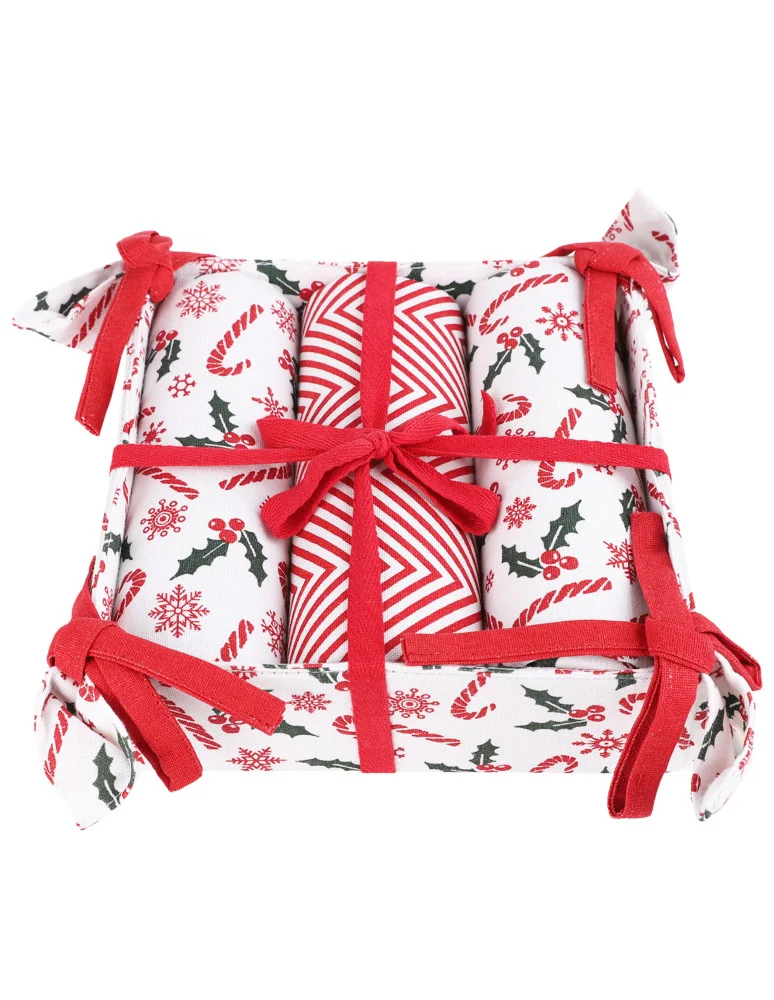 Ściereczki są zapakowane w elegancki koszyczek z materiału – idealny jako gotowy prezent świąteczny dla bliskich, przyjaciół lub jako dodatek do świątecznego wystroju kuchni. Koszyczek może posłużyć także jako organizer lub dekoracyjna taca.