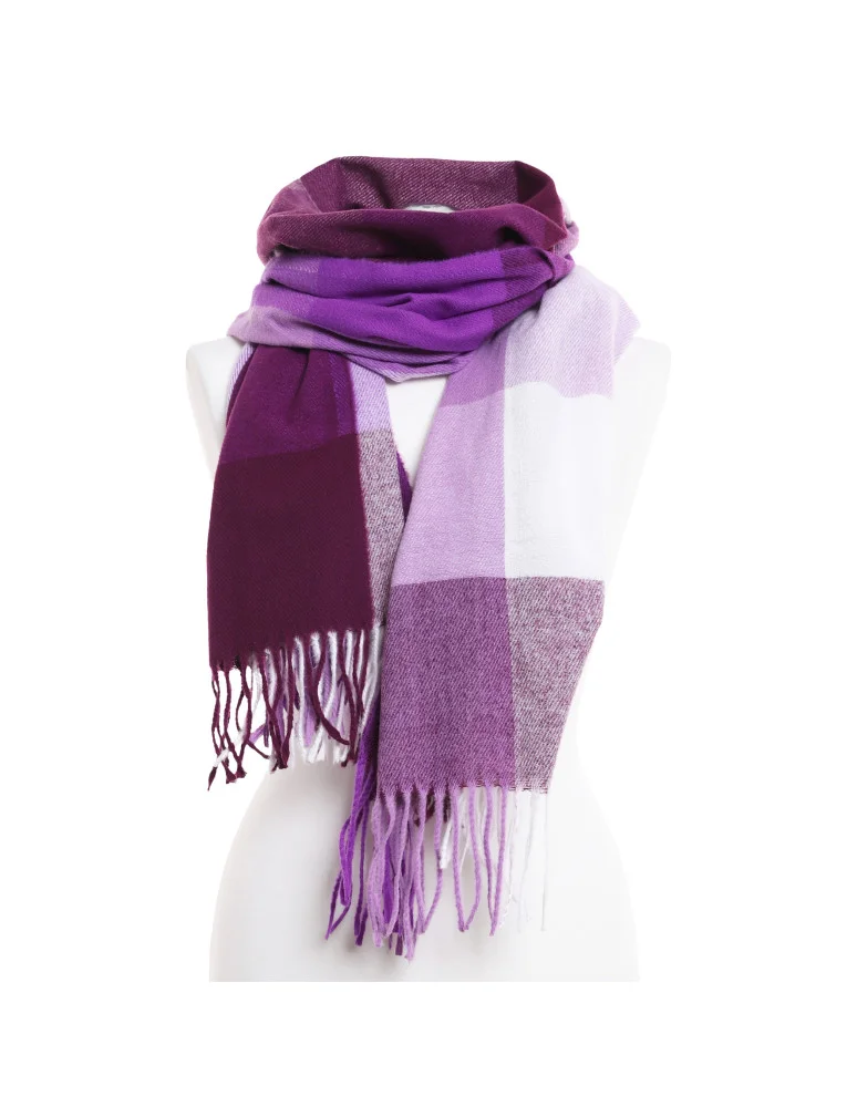 Szal damski w kratę wykończony frędzlami FIOLETOWY