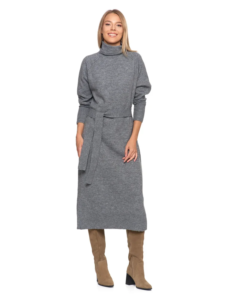 Otul się miękkością i komfortem w tej stylowej dzianinowej sukience maxi. Model o sweterkowej strukturze, wykonany z miękkiej i ciepłej dzianiny, idealnie sprawdzi się w sezonie jesienno-zimowym. Klasyczny, minimalistyczny fason podkreślony został eleganckim golfem, długim rękawem i praktycznym wiązaniem w talii, które akcentuje kobiecą sylwetkę. Subtelne rozcięcia po bokach dodają lekkości i zapewniają wygodę podczas chodzenia.