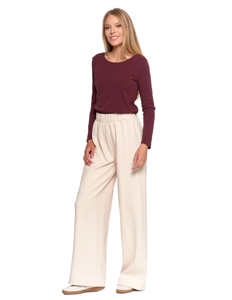 Damskie spodnie dresowe ocieplane z szeroką nogawką i haftem KREMOWY