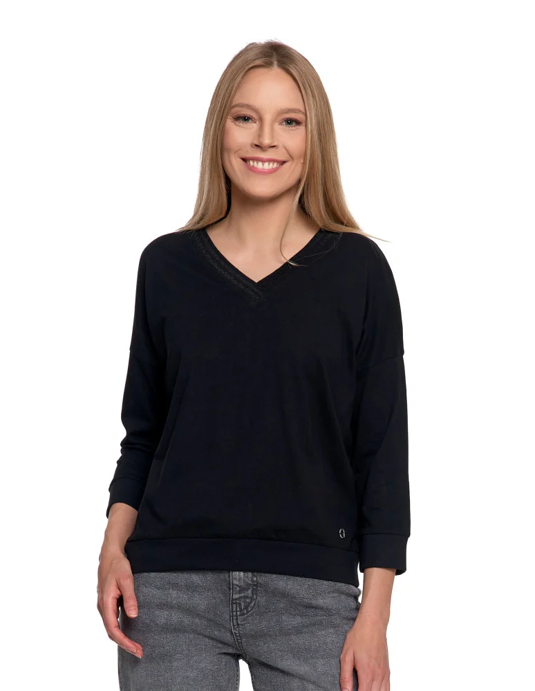 Damska bluzka z dekoltem w serek i ozdobnym wykończeniem CZARNY