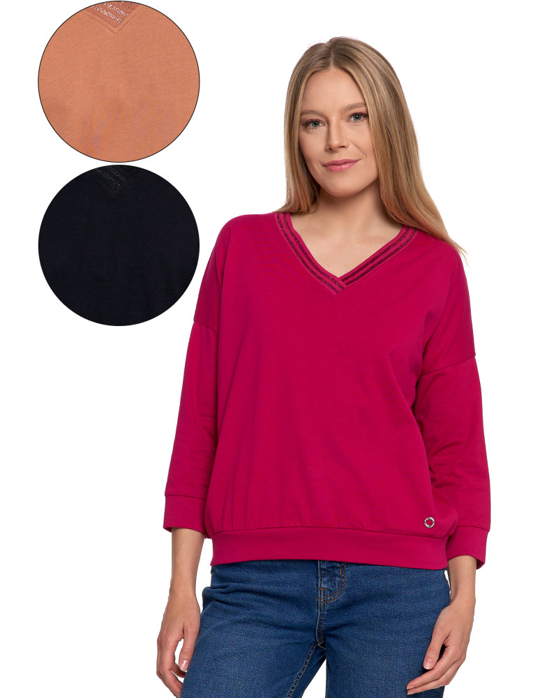 Wygodna bluzka damska z dekoltem w kształcie litery V to doskonały wybór na co dzień i na bardziej casualowe okazje. Model wyróżnia się luźnym krojem z lekko opuszczoną linią ramion, który zapewnia komfort noszenia i swobodę ruchów. Dekolt ozdobiono subtelnym połyskującym wykończeniem, dodającym bluzce kobiecego charakteru i nuty elegancji.