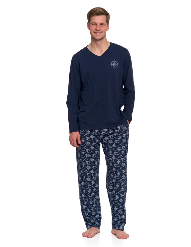 Piżama męska bawełniana z nadrukiem kompasu GRANATOWY