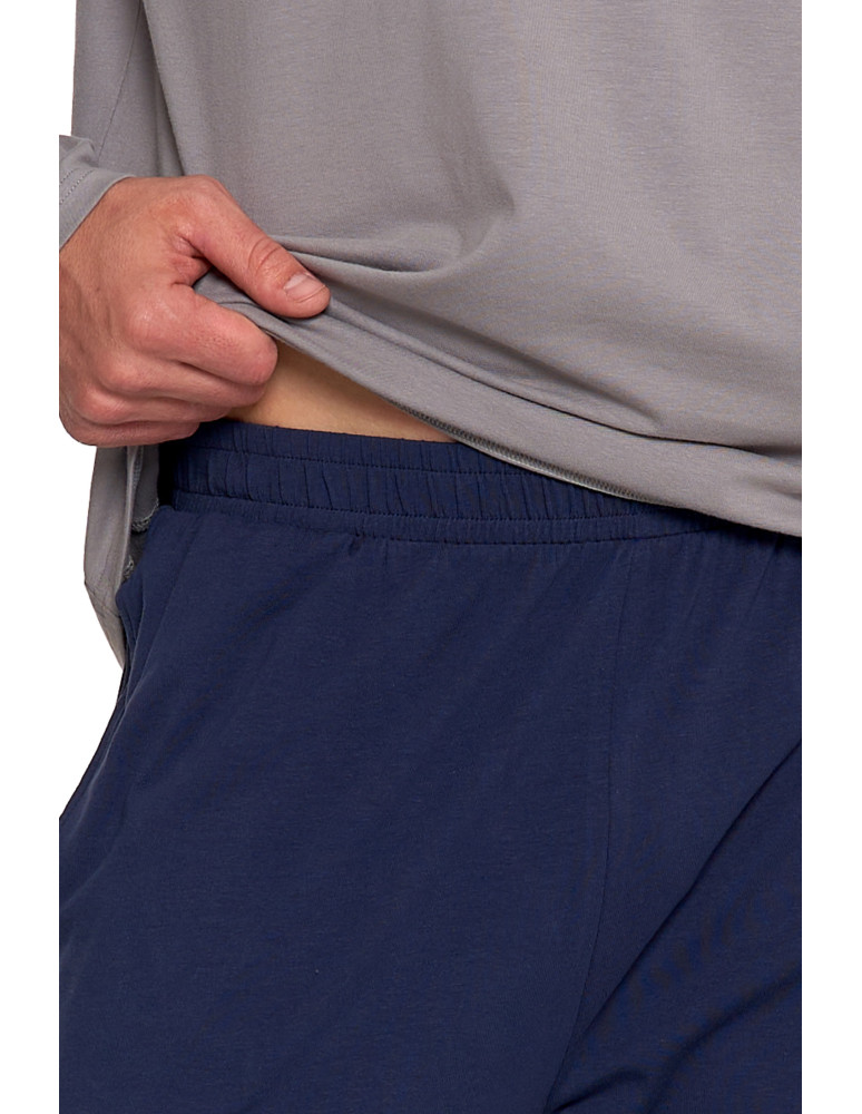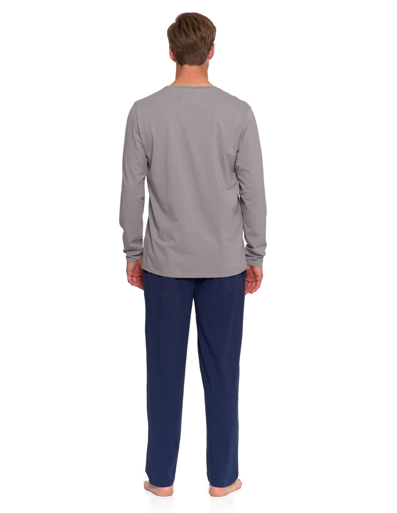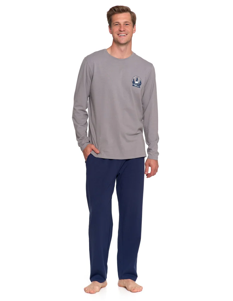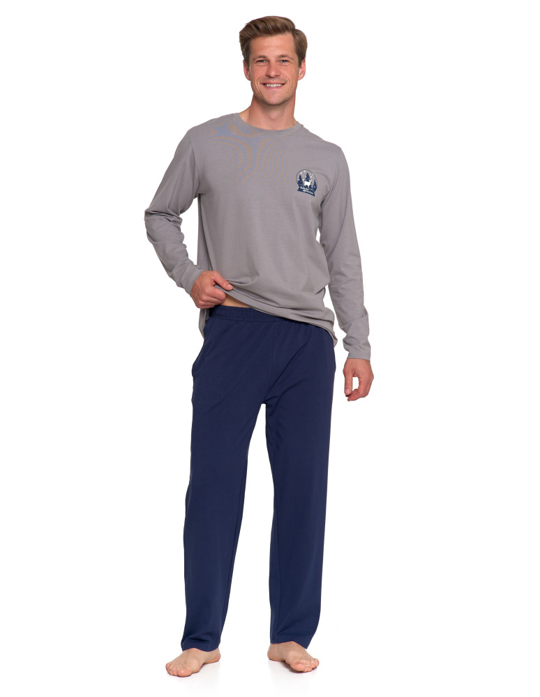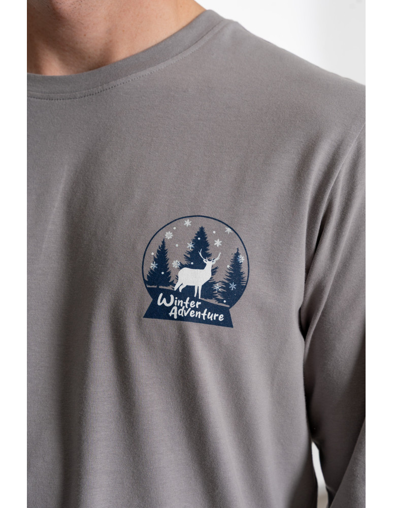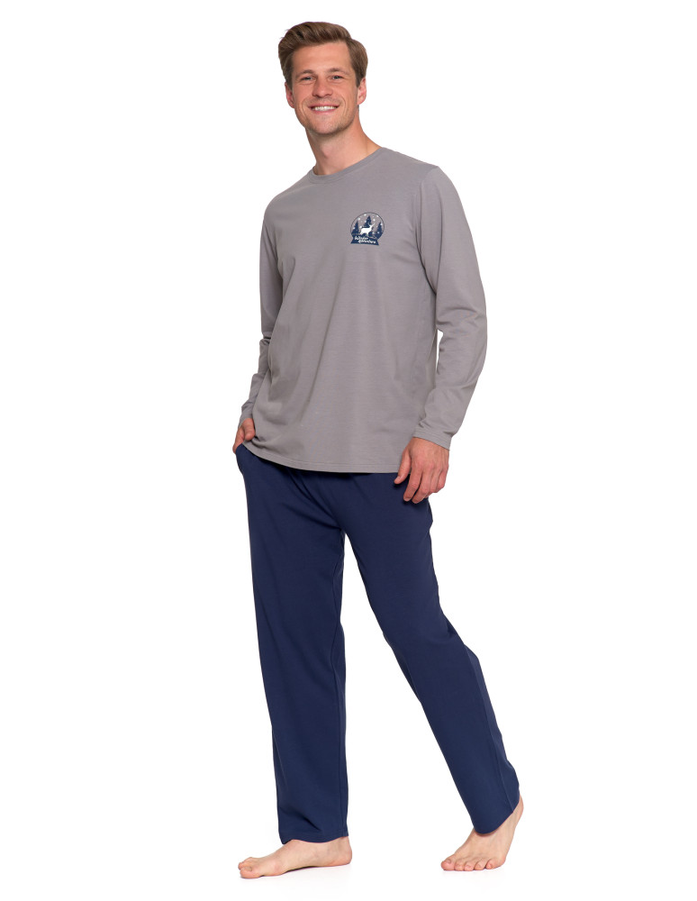 Męska piżama z długim rękawem wykonana z miękkiej, oddychającej bawełny, idealna na każdą porę roku. Góra w odcieniu chłodnej szarości, ozdobiona subtelnym nadrukiem "Winter Adventure" na piersi, dodaje całości charakteru. Klasyczny fason z okrągłym dekoltem bez guzików zapewnia prostotę i wygodę.