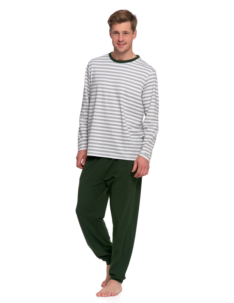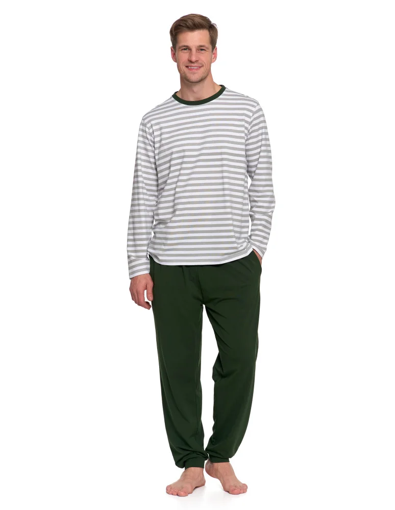 Wygodna piżama męska z długim rękawem to doskonały wybór na każdą porę roku. Góra w ponadczasowe, poziome pasy w odcieniach bieli i jasnoszarego, z wykończeniem przy szyi w kolorze ciemnej zieleni, dodaje charakteru i lekkości. Spodnie w kolorze butelkowej zieleni świetnie uzupełniają całość, tworząc spójny, nowoczesny zestaw do snu.