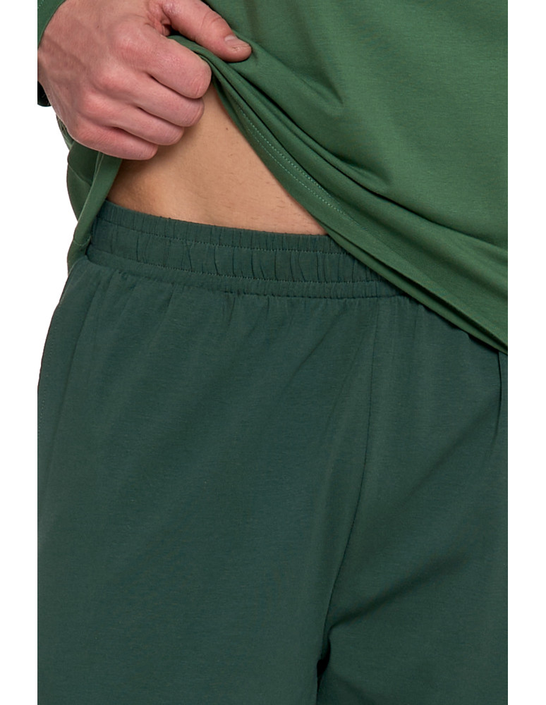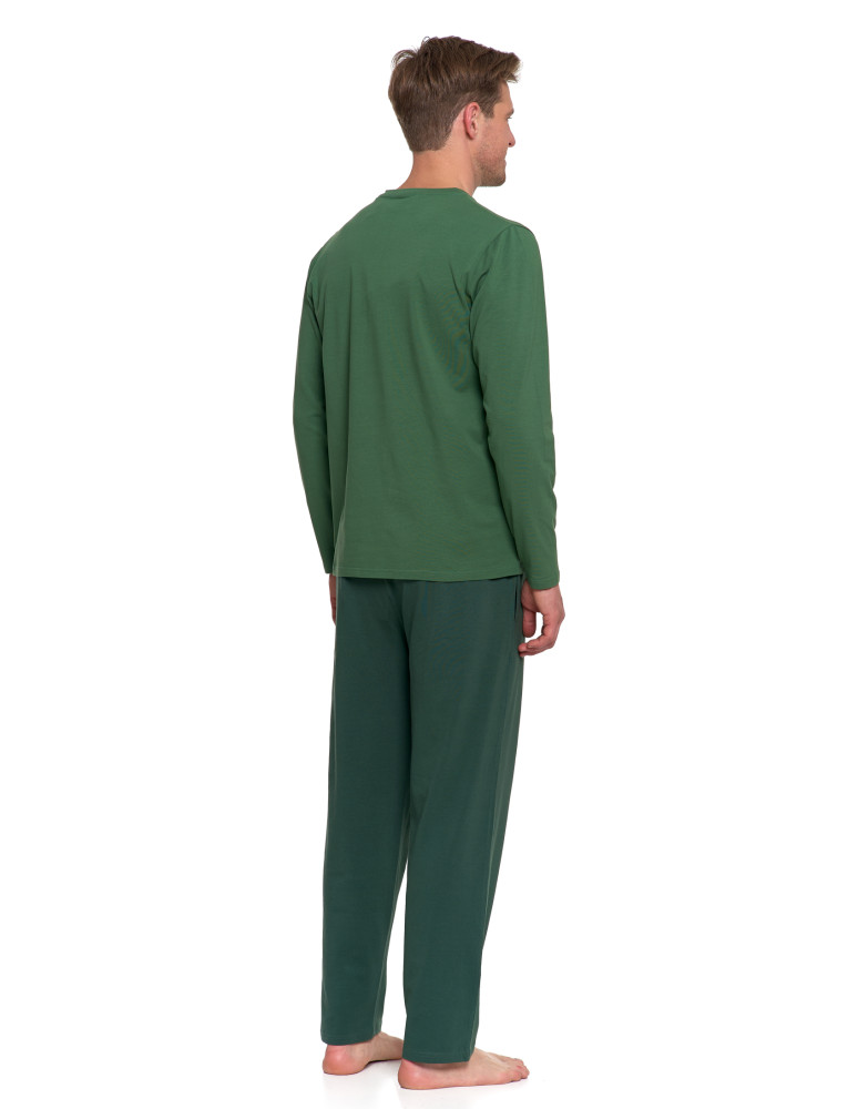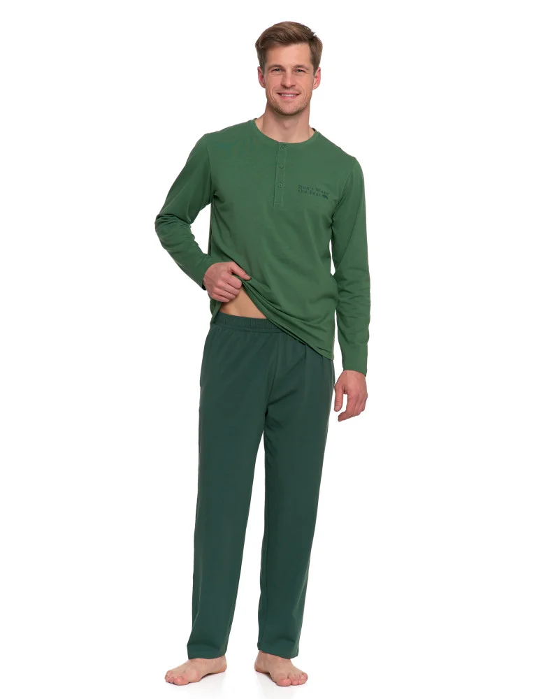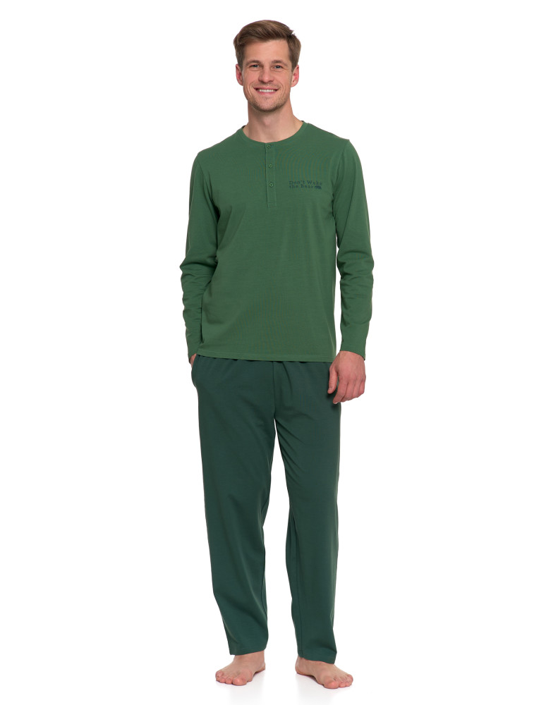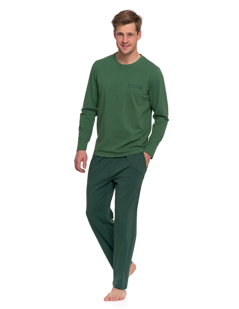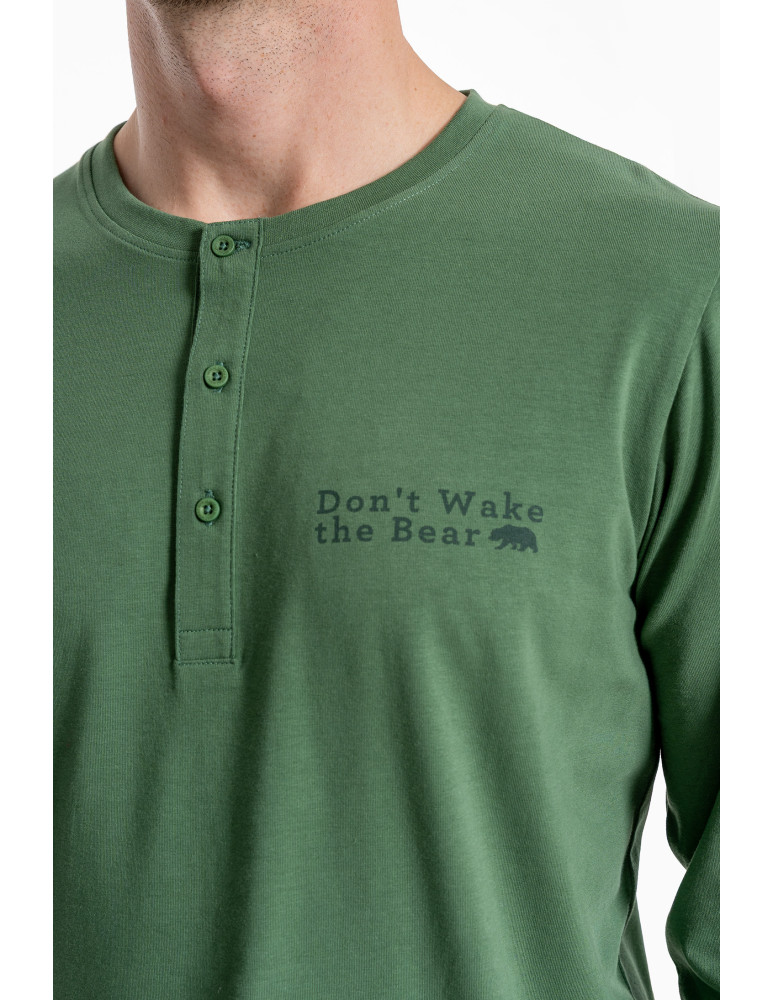 Męska piżama w odcieniu zieleni wykonana z miękkiej, przyjemnej w dotyku bawełny. Model składa się z gładkiej koszulki z długim rękawem oraz prostych spodni. Góra z okrągłym dekoltem i praktycznym zapięciem na guziki. Na piersi znajduje się subtelny nadruk Don't Wake the Bear. Spodnie z komfortową gumką w pasie, proste, z kieszeniami. Brak metki na karku zapewnia dodatkową wygodę podczas noszenia.