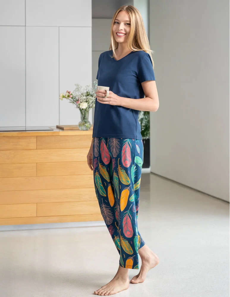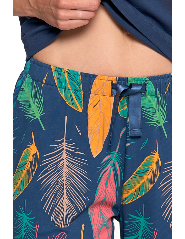 Uwagę przyciągają długie spodnie we wzór barwnych piór, które nadają piżamie oryginalnego i lekkiego charakteru. Luźny krój oraz elastyczna talia z satynową tasiemką gwarantują doskonałe dopasowanie i swobodę ruchów. To praktyczny i stylowy zestaw, który umili każdy wieczór i nocny odpoczynek.