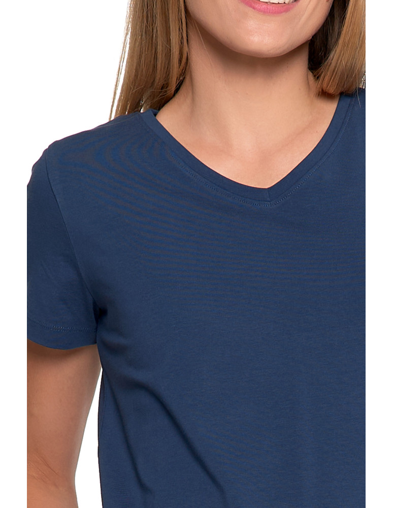 - Koszulka z krótkim rękawem i dekoltem V – klasyczna i wygodna.