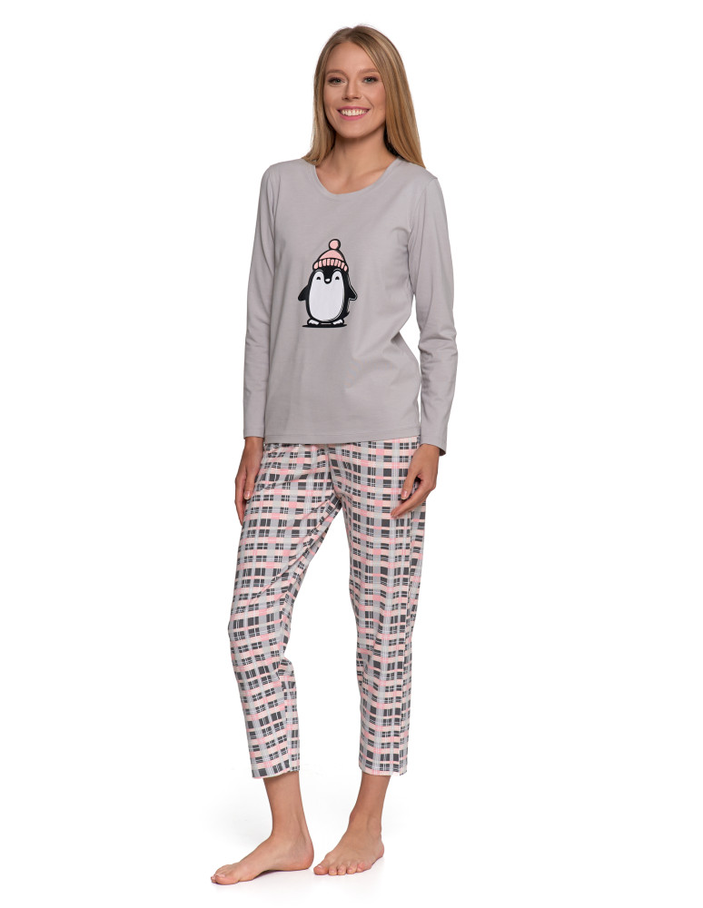 Piżama damska bawełniana z długim rękawem i nadrukiem pingwinka SZARY