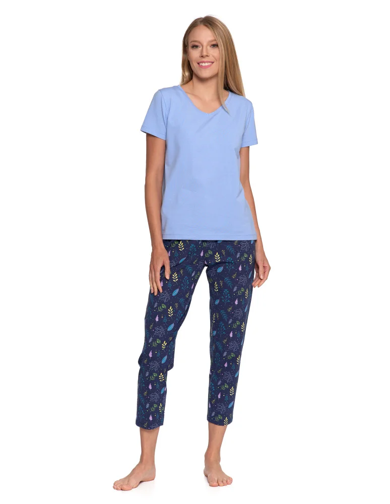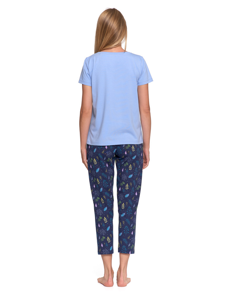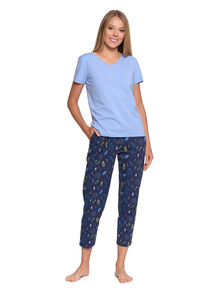 Piżama damska z krótkim rękawem i wzorzystymi spodniami NIEBIESKI