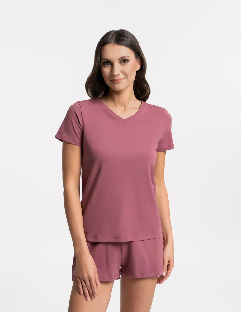Piżama damska bawełniana z krótkim rękawem i spodenkami CIEMNY RÓŻOWY