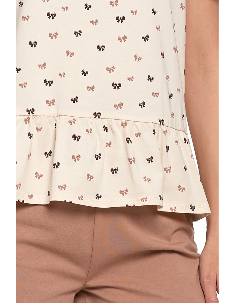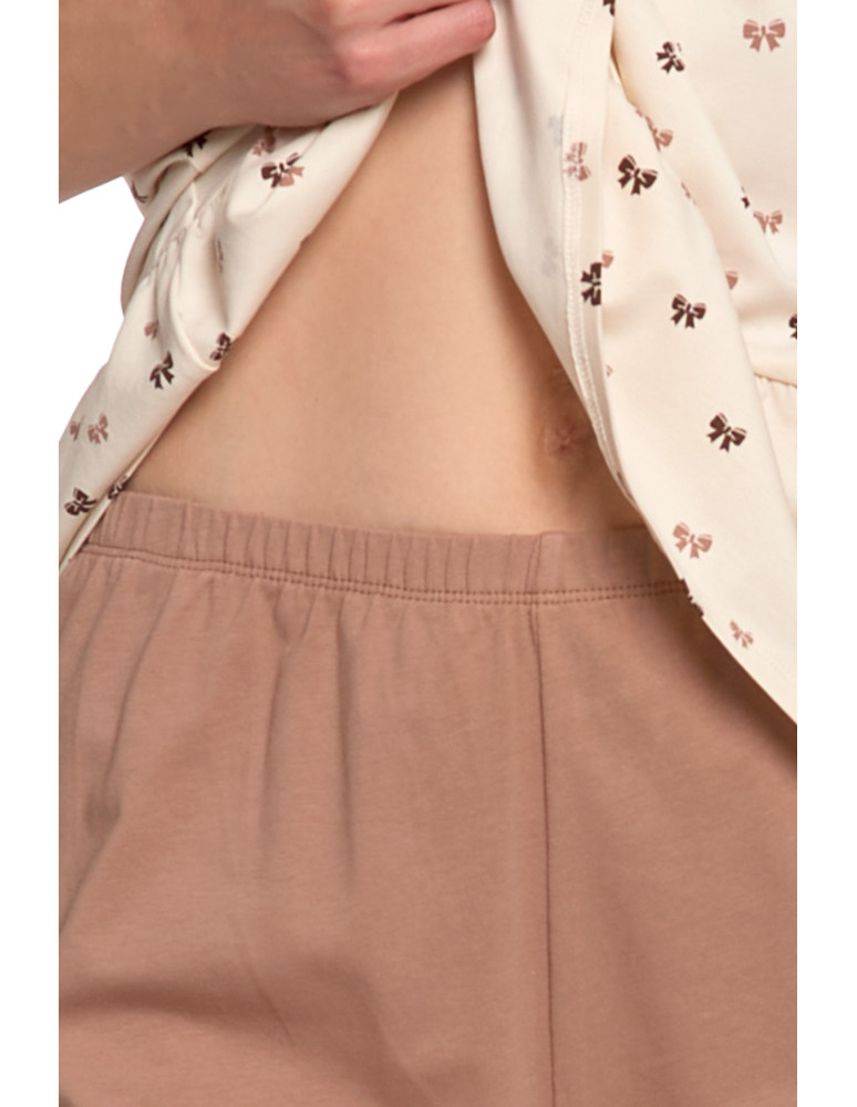 Piżama damska z krótkim rękawem i szortami z kokardkami BEŻOWY